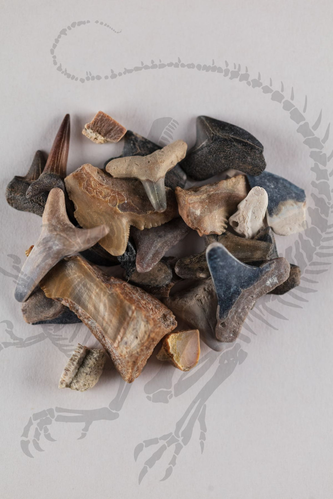 Sharks are a group of predatory cartilaginous fish that first appeared over 420 million years ago, making them older than dinosaurs and trees. These teeth are found in the eastern Mississippi and date back 75 million years. The long skinny teeth belong to the prehistoric goblin shark Scapanorhynchus. The short fat teeth belong to the cow shark relative Squalicorax. The long, triangular ones belong to the great white shark lookalike, Cretoxyrhina.