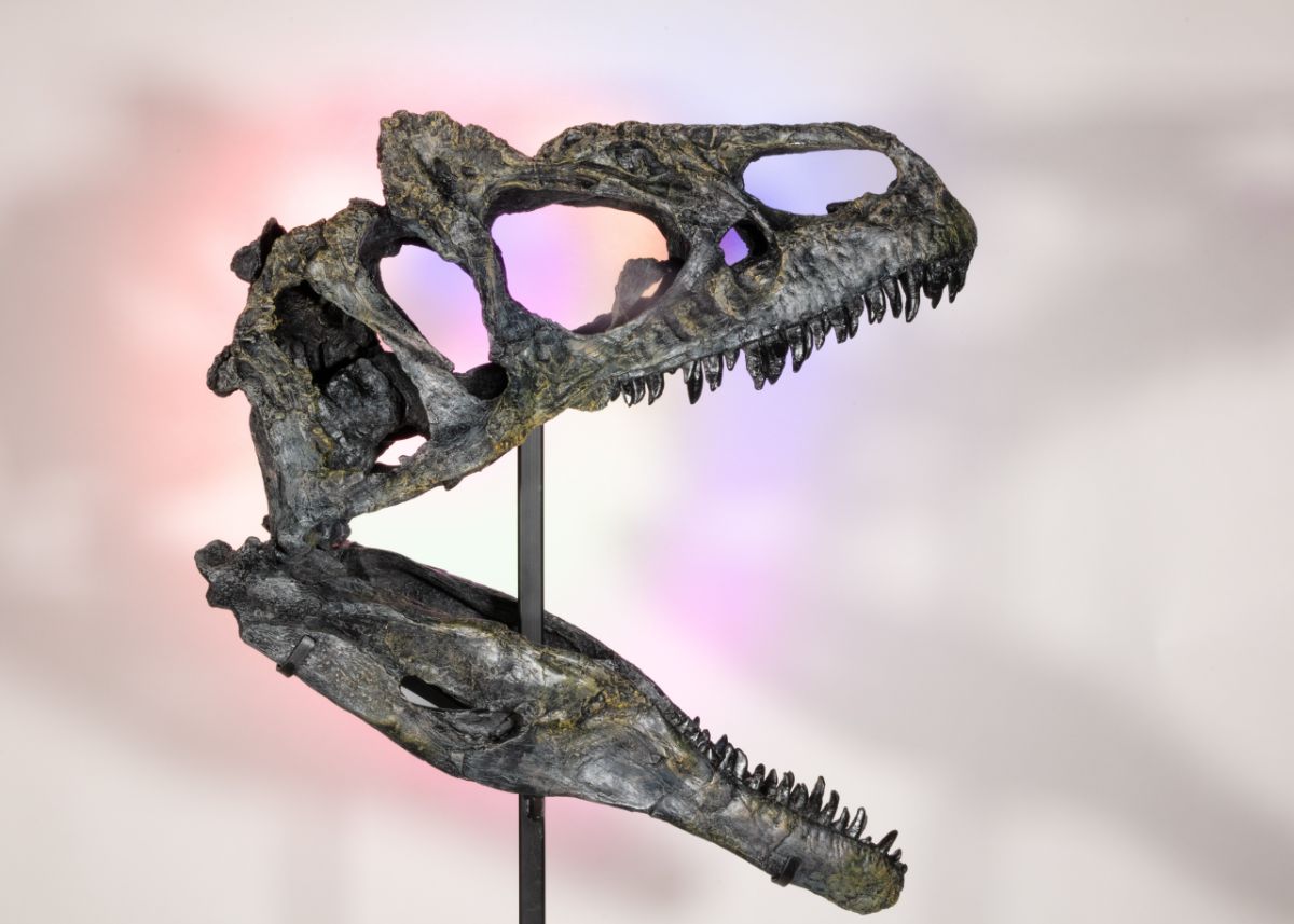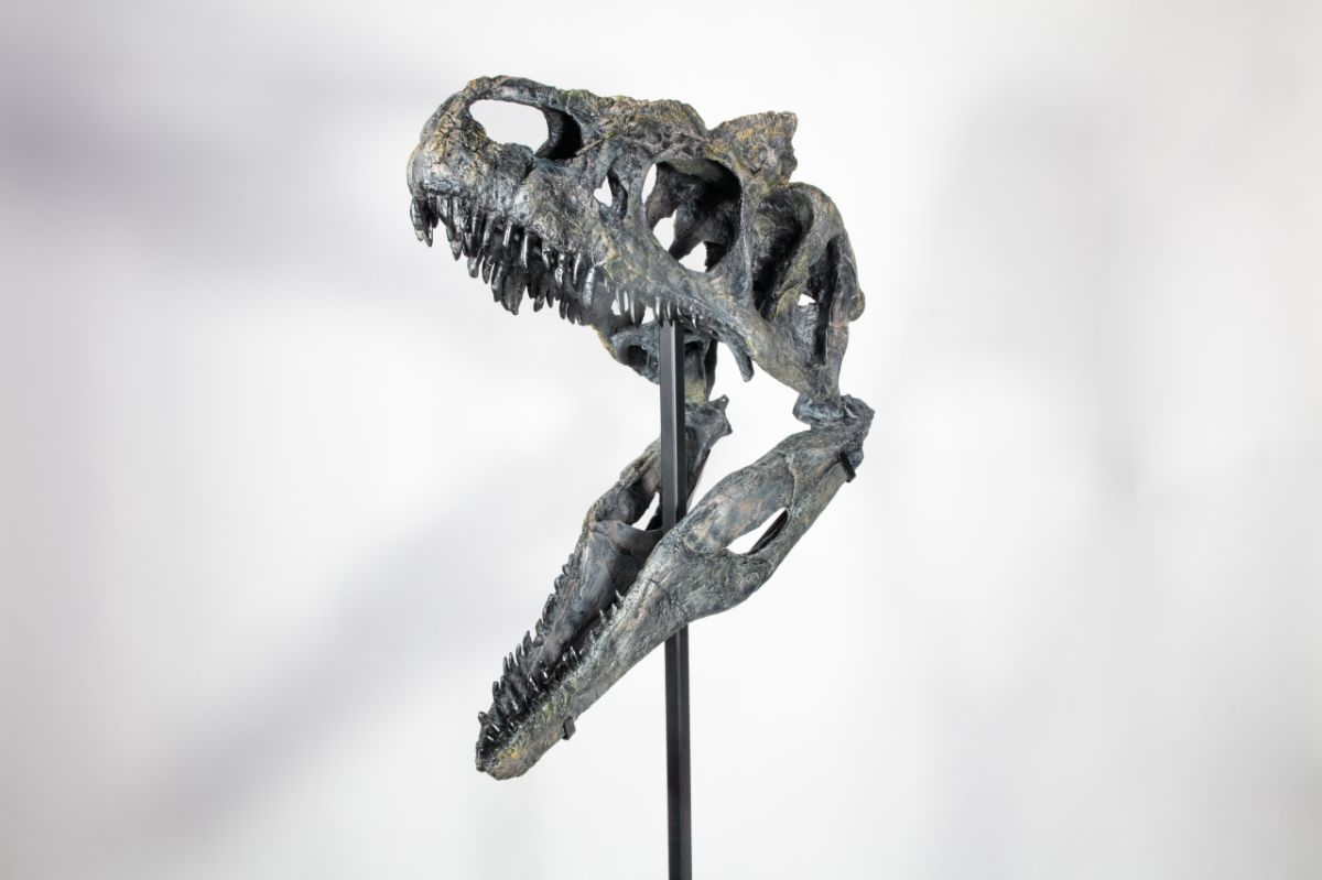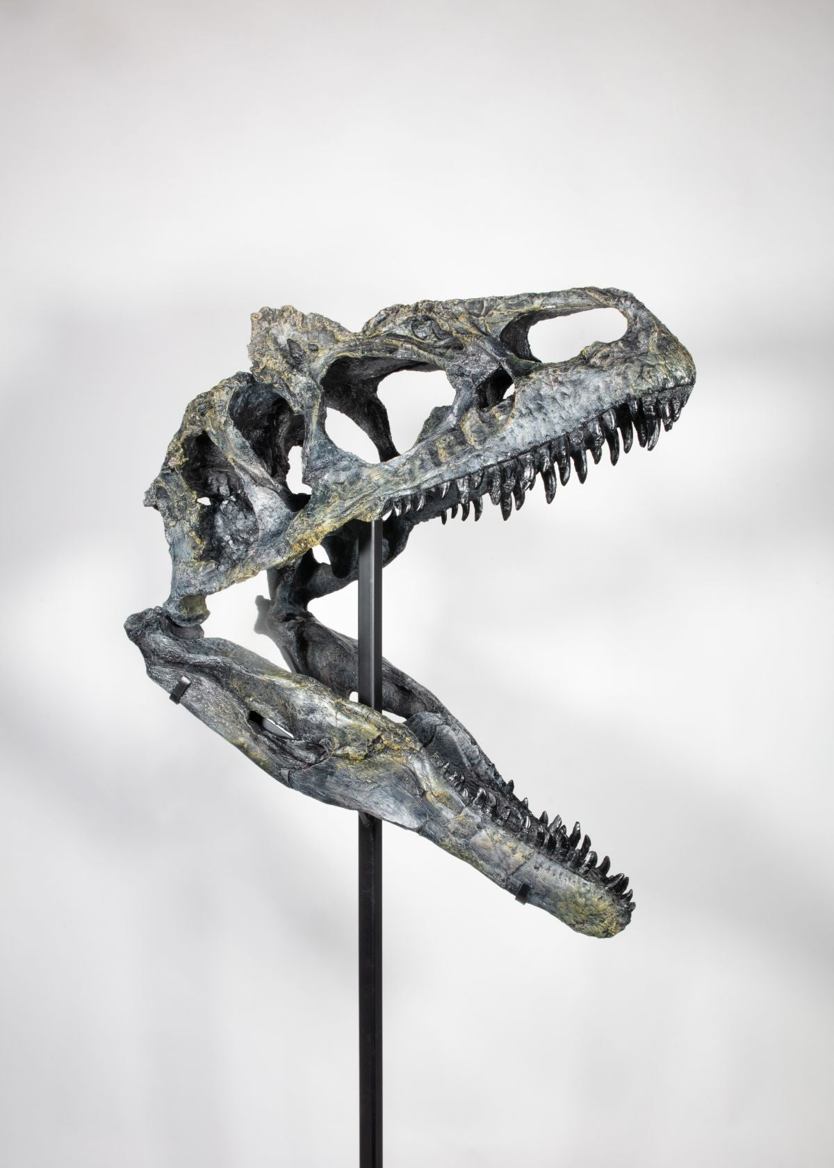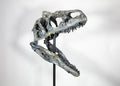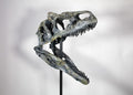 A stunning cast molded directly from the Allosaurus jimmadseni specimen, Dracula, everything from the sharply exaggerated lacrimal horns to the elegant jaws filled with serrated teeth makes this skull a must have for any large scale collector of the past. All of the detail is immaculately preserved in this cast, from the wrinkled enamel on the teeth, to the grain of all the bones in the skull. Hand-painted to match the original fossil in every way, and on a customized steel mount, this astounding skull is sure to be the center piece of any collection, display, exhibition, or even just in your home! Includes laminated info card, or laminated sign for framing depending on preference. Dracula’s skull fits snugly and securely into a custom built “grab around” mount that shows off his fearsome jaws. Utah’s own state fossil, the mighty skull of the Jurassic period’s top predator comes off the mount in 3 pieces, and the mount itself is easily dismantled into five main parts as well. Allosaurus was a large meat eating dinosaur that lived in the Jurassic Period, about 145 million years ago. An apex predator of its environment, it most likely hunted in groups, taking down huge long necked sauropod dinosaurs like Apatosaurus and armored herbivores like Stegosaurus. Allosaurus attained sizes of 30 feet long, 10 feet tall, and weighed around 3 tons. Despite being as long as a school bus it was incredibly agile, able to run and even possibly leap. Despite being several dozen times times larger than a Lion, it had approximately the same bite force. Allosaurus compensated for this with a “hatchet jaw” ability- opening its jaws to an incredibly wide 92 degrees, and swinging its skull onto its prey. This Allosaurus specimen, Dracula, has been mounted with the jaws opened to this angle as a representation of this deadly attack.