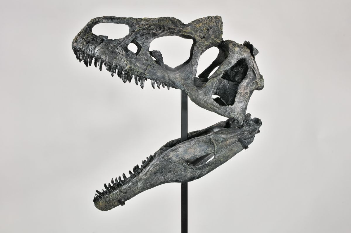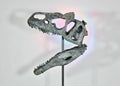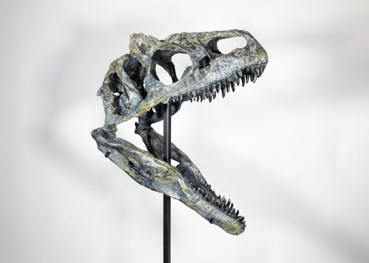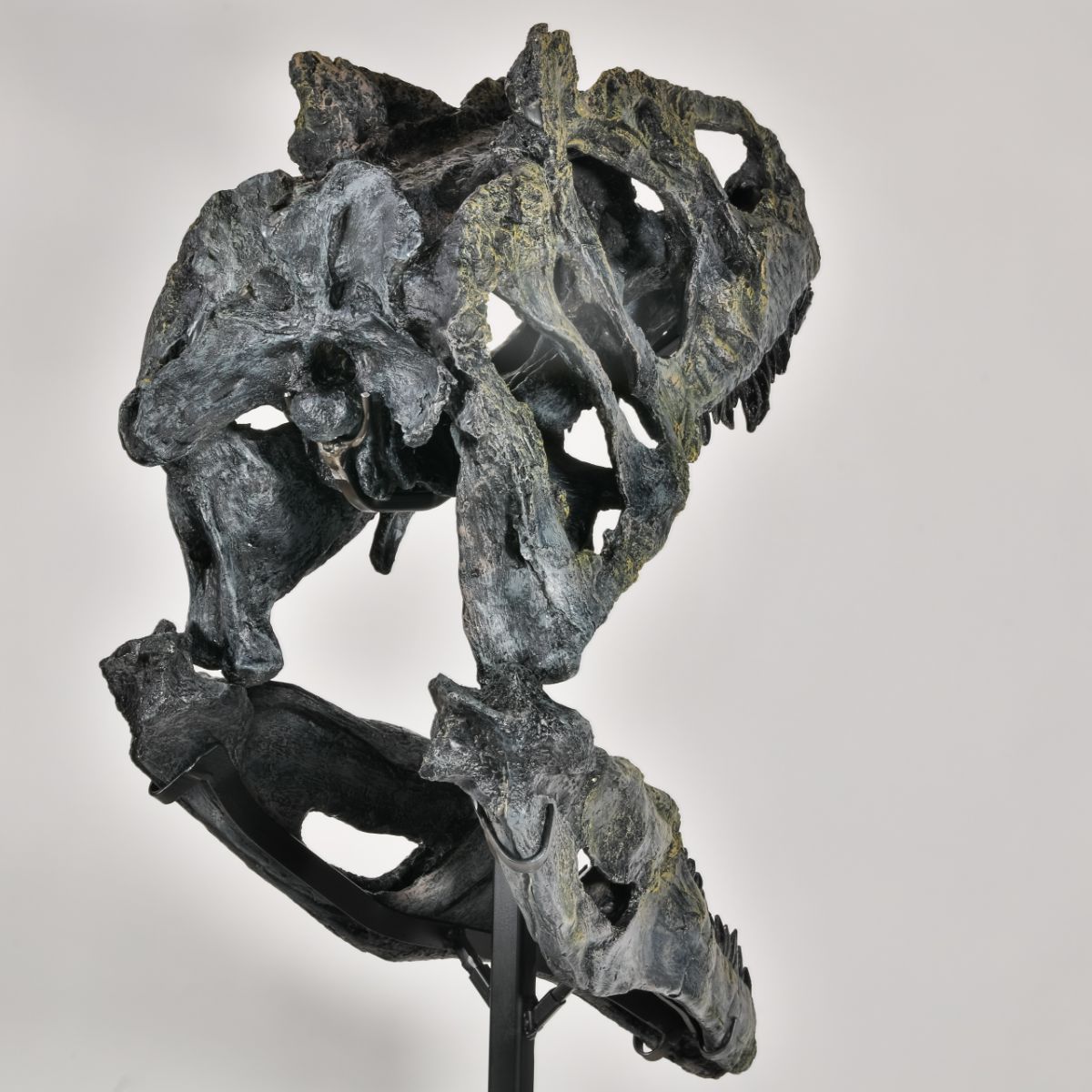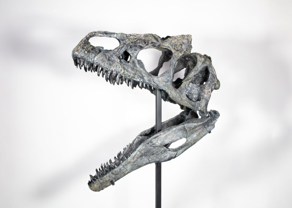 A stunning cast molded directly from the Allosaurus jimmadseni specimen, Dracula, everything from the sharply exaggerated lacrimal horns to the elegant jaws filled with serrated teeth makes this skull a must have for any large scale collector of the past. All of the detail is immaculately preserved in this cast, from the wrinkled enamel on the teeth, to the grain of all the bones in the skull. Hand-painted to match the original fossil in every way, and on a customized steel mount, this astounding skull is sure to be the center piece of any collection, display, exhibition, or even just in your home! Includes laminated info card, or laminated sign for framing depending on preference. Dracula’s skull fits snugly and securely into a custom built “grab around” mount that shows off his fearsome jaws. Utah’s own state fossil, the mighty skull of the Jurassic period’s top predator comes off the mount in 3 pieces, and the mount itself is easily dismantled into five main parts as well. Allosaurus was a large meat eating dinosaur that lived in the Jurassic Period, about 145 million years ago. An apex predator of its environment, it most likely hunted in groups, taking down huge long necked sauropod dinosaurs like Apatosaurus and armored herbivores like Stegosaurus. Allosaurus attained sizes of 30 feet long, 10 feet tall, and weighed around 3 tons. Despite being as long as a school bus it was incredibly agile, able to run and even possibly leap. Despite being several dozen times times larger than a Lion, it had approximately the same bite force. Allosaurus compensated for this with a “hatchet jaw” ability- opening its jaws to an incredibly wide 92 degrees, and swinging its skull onto its prey. This Allosaurus specimen, Dracula, has been mounted with the jaws opened to this angle as a representation of this deadly attack.
