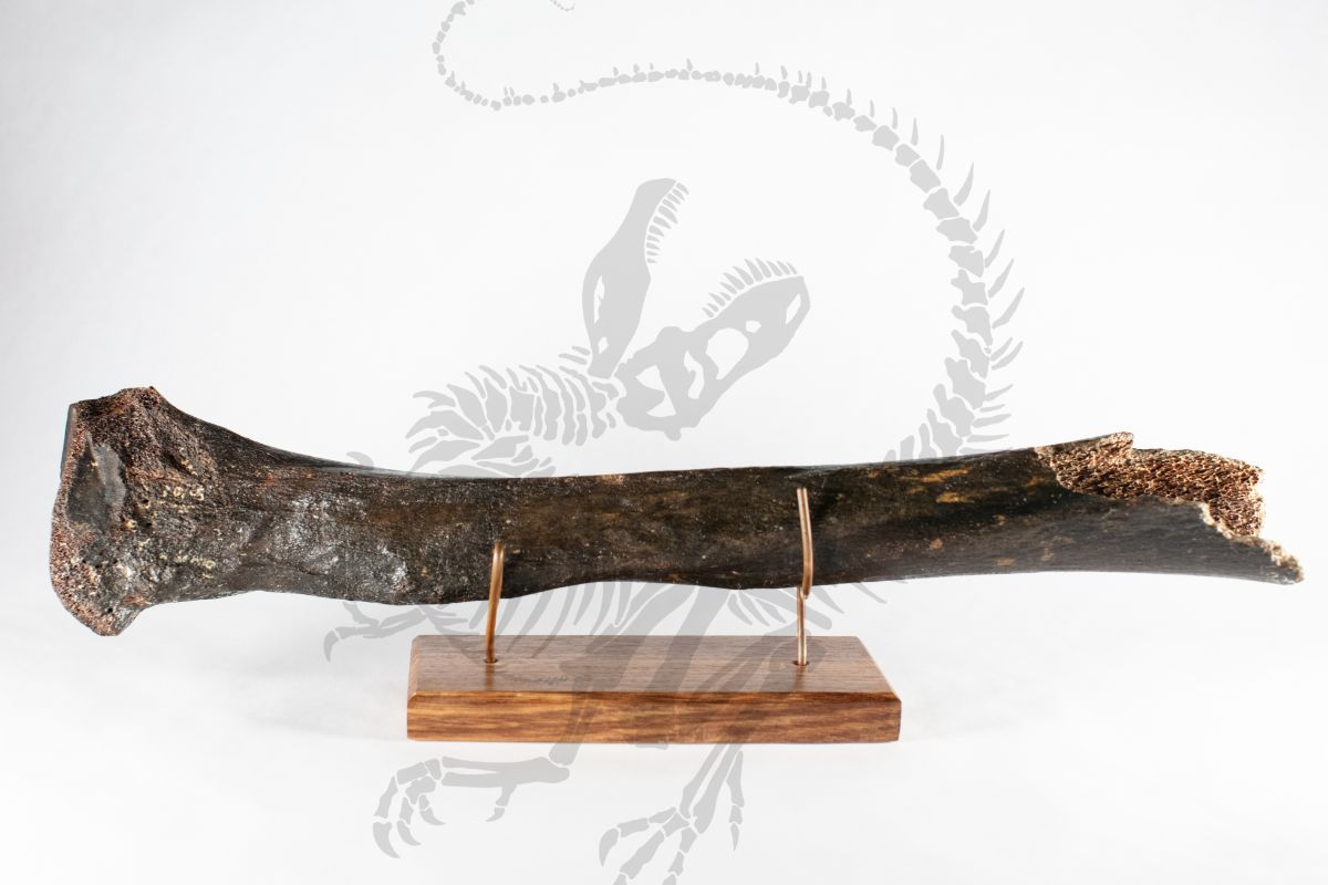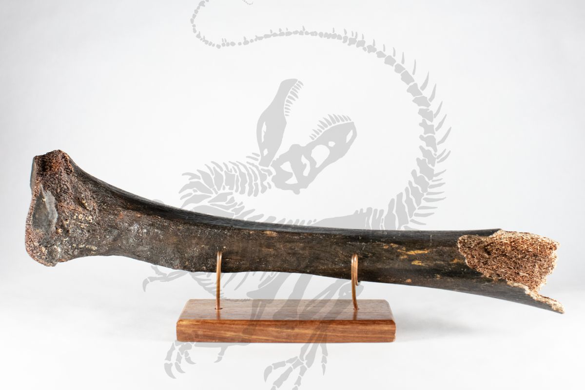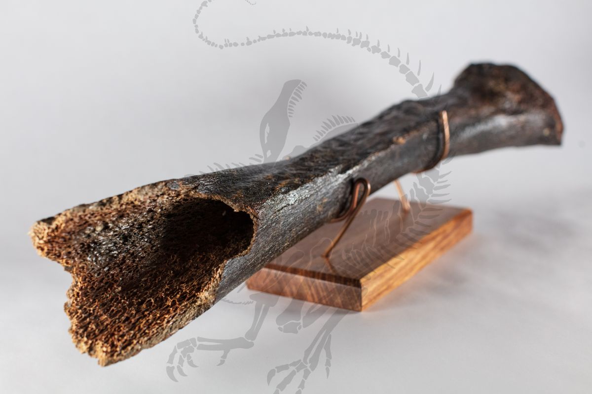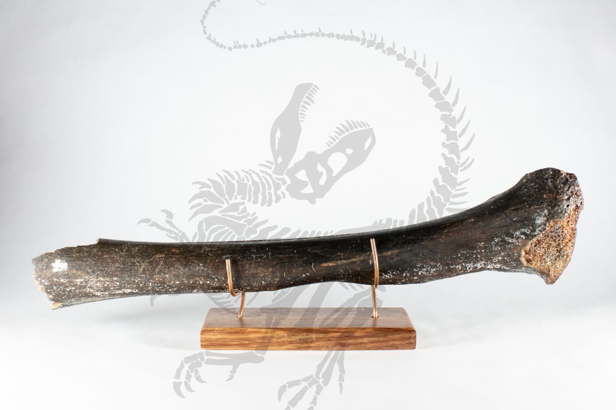 Mammoths are some of the most iconic and beloved of all prehistoric species, only dinosaurs matching them. Their huge size and majesty makes them infinitely well known and popular. This authentic forelimb bone, a radius, belonged to a newborn infant Mammoth and is preserved in incredible form. One end is broken, and allows the owner to look insider the bone at the pores and hollows which further highlight the incredible quality of preservation. Comes on a custom hardwood stand. Mammoths were large pachyderms that dominated the Pleistocene landscape until about 10,000 years ago. Closely related to today’s Indian Elephant, they looked very similar- but were often larger and covered in shaggy fur. There were several species of Mammoth, but the most famous is the Wooly Mammoth. These large herbivores were so big that only large packs of predators like Smilodon or Dire wolves could take them down.