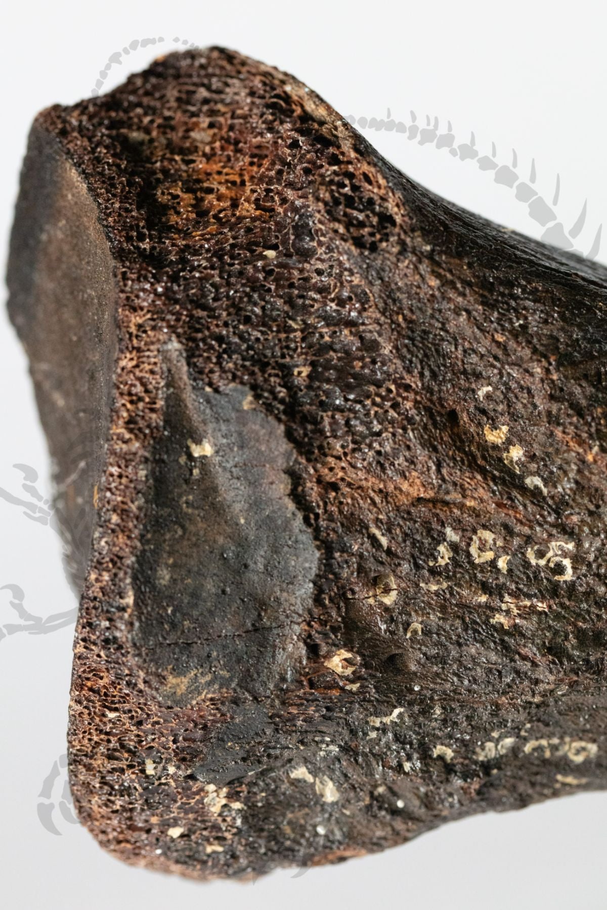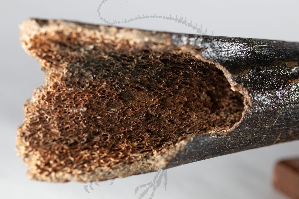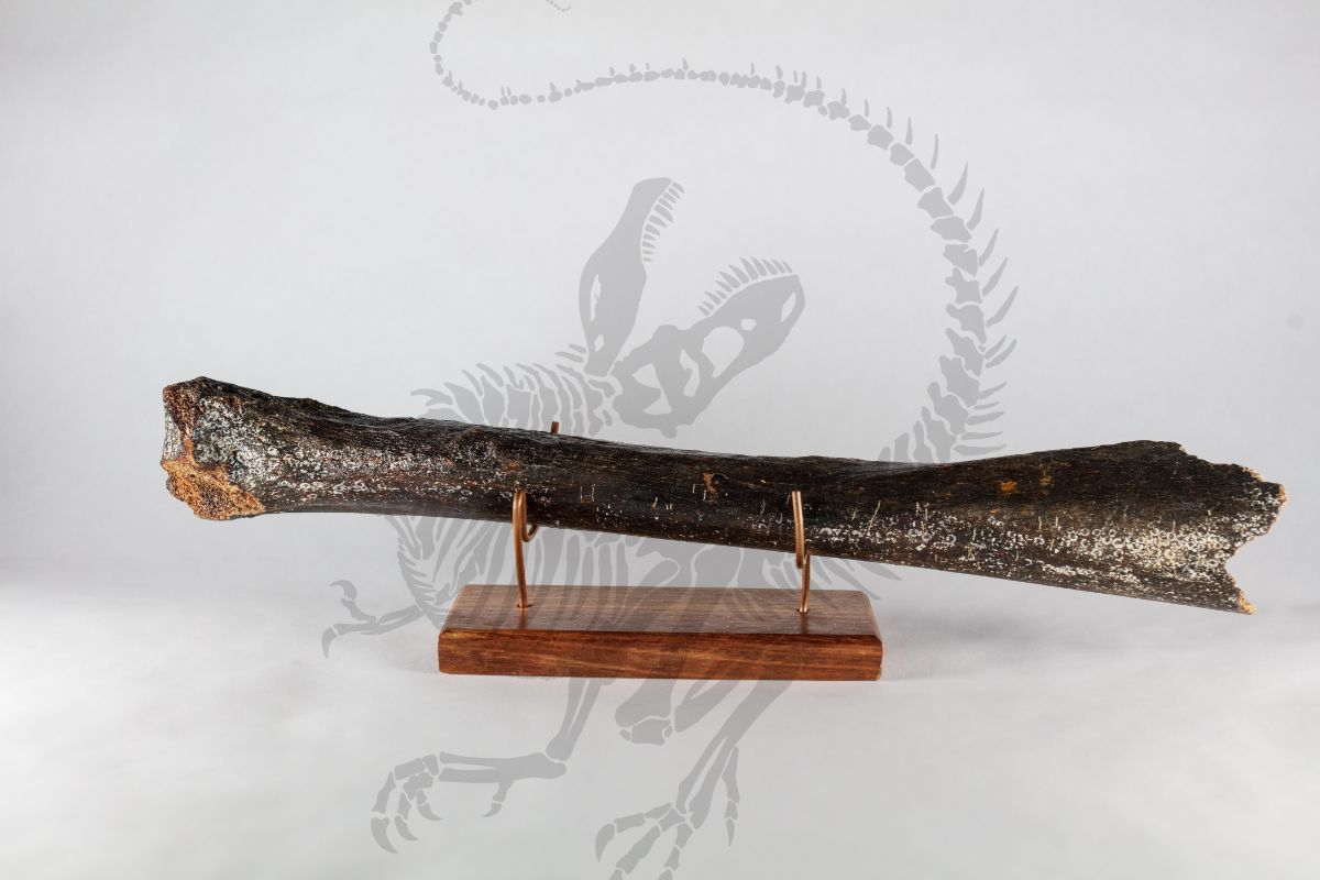 Mammoths are some of the most iconic and beloved of all prehistoric species, only dinosaurs matching them. Their huge size and majesty makes them infinitely well known and popular. This authentic forelimb bone, a radius, belonged to a newborn infant Mammoth and is preserved in incredible form. One end is broken, and allows the owner to look insider the bone at the pores and hollows which further highlight the incredible quality of preservation. Comes on a custom hardwood stand. Mammoths were large pachyderms that dominated the Pleistocene landscape until about 10,000 years ago. Closely related to today’s Indian Elephant, they looked very similar- but were often larger and covered in shaggy fur. There were several species of Mammoth, but the most famous is the Wooly Mammoth. These large herbivores were so big that only large packs of predators like Smilodon or Dire wolves could take them down.