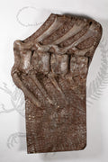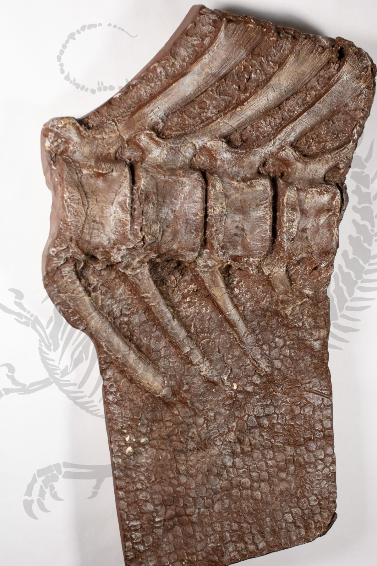 This cast was molded from a real incredibly rare specimen of the duck-billed dinosaur Brachylophosaurus, where not only did the bones fossilize, but the scaly skin did as well. This allows the viewer to see both the caudal (tail) vertebra and each pebbly scale of this ancient dinosaur. This stunning piece also comes on a custom-made hardwood mount that allows the owner to easily hang it on their wall. This is sure to be a show stopper in any collection or display. Brachylophosaurus was a mid sized hadrosaur (duck-billed) dinosaur from the North American Late Cretaceous, about 75 million years ago. Brachylophosaurus could reach 35 feet long and weigh up to 7 tons. Several specimens of these animals have been discovered with ossified tendons (tendons that turn to bone to support the tail) and even soft tissue preservation! This means we know what the internal organs, muscles, and even skin looks like on these large herbivores!