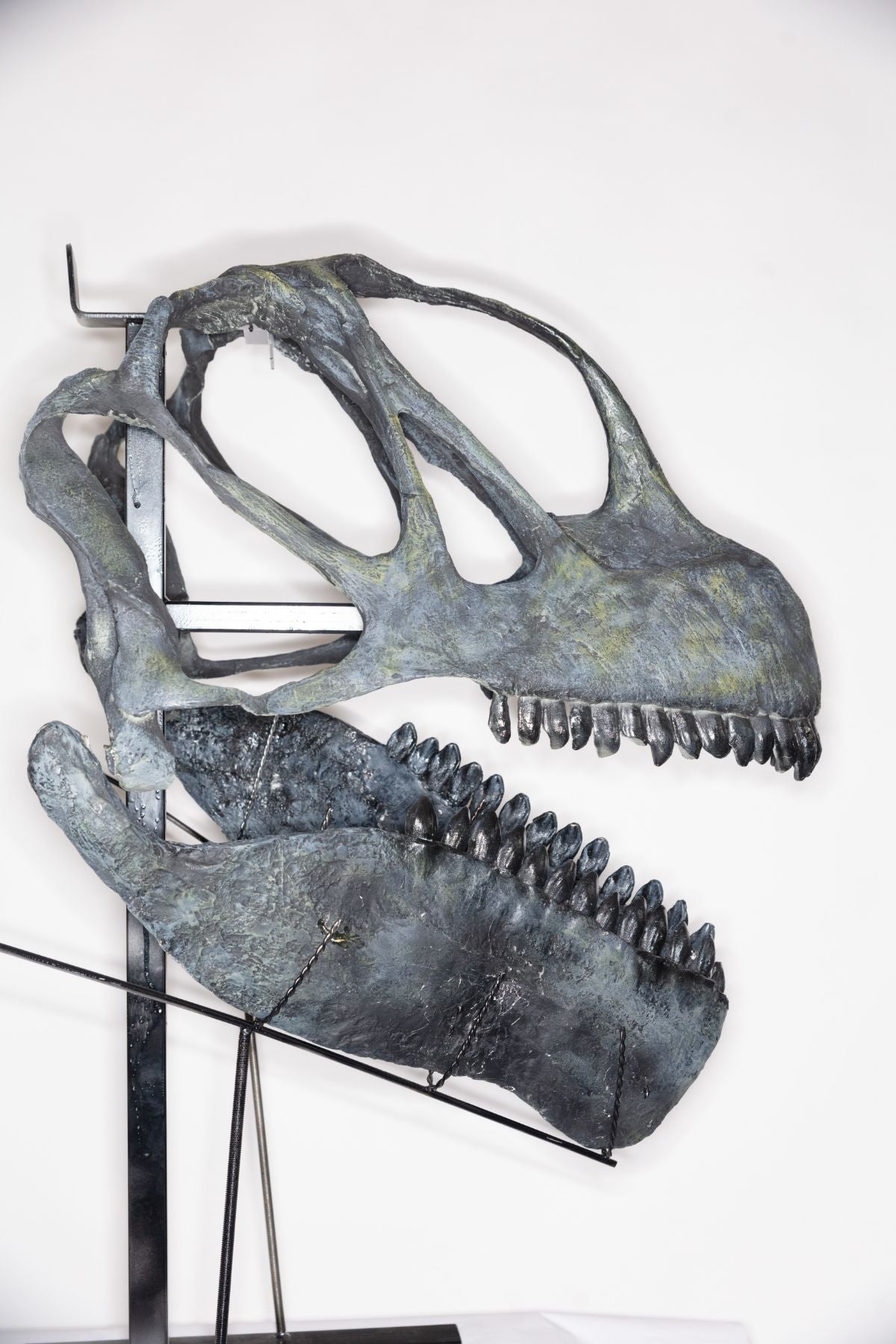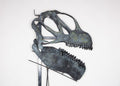 This incredible skull was molded off of a real fossil specimen belonging to the Jurassic age behemoth, Camarasaurus. All of the detail is immaculately preserved in this cast, from the wrinkled enamel on the teeth, to the grain of all the bones in the skull. Hand-painted to match the original fossil in every way, and on a customized steel mount, this astounding skull is sure to be the center piece of any collection, display, exhibition, or even just in your home! Camarasaurus was a giant sauropod (or long-necked) dinosaur from the Late Jurassic Period, living about 145 million years ago. It was North American, roaming the forests and plains of the ancient United States. Although it was not quite as large as some of its behemoth cousins it coexisted with, such as Brachiosaurus or Supersaurus, it was still an impressively massive animal. Camarasaurus could reach nearly 80 feet in length, nearly 40 feet tall, and weighed up to 50 tons! Meaning one animal could weigh as much as an entire herd of elephants. Camarasaurus and its larger close relative Brachiosaurus had a stockier frame with a taller posture than its cousins that belonged to the diplodocid family. It also possessed a larger skull with a prominent nasal ridge and sturdy spoon-shaped teeth. It most likely ate tough conifer trees and plant material that was higher off the ground, making sure not to compete with the other many species of giant sauropods. Despite being so large, Camarasaurus still had to be weary of predators such as Allosaurus, Torvosaurus, and Ceratosaurus.