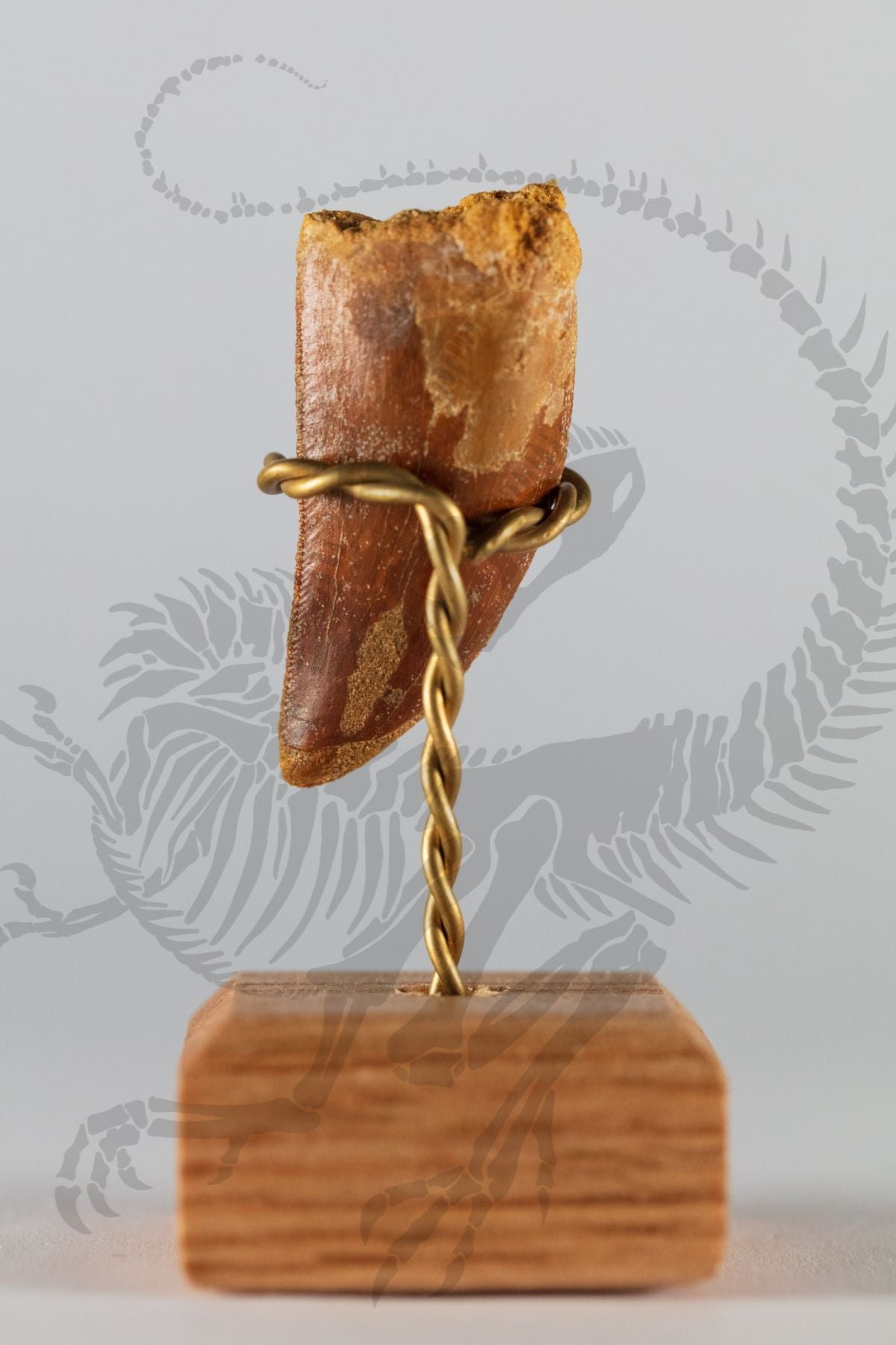 Authentic fossil tooth to the giant carnivorous dinosaur, Carcharodontosaurus, from the Kem Kem beds in Morocco. A beautiful and giant tooth to a fearsome and massive apex predator complete with stunning serrations on either side of the tooth. Made even more rare by it's placement, this is a premaxillary tooth belonging in the front of the jaw. Comes with custom hardwood stand. Carcharodontosaurus was a large carnivore from the mid Cretaceous period in Africa, about 100 million years ago. It was a giant among the meat eating dinosaurs, only being rivaled in size by its similar cousin Giganotosaurus, the heavier T. rex, and it’s contemporary, the Spinosaurus. It reached lengths of 45 feet long, and weighed up to 7 tons, and used its knife-like teeth that gave this “shark toothed” reptile it’s name to slice the flesh of its prey.