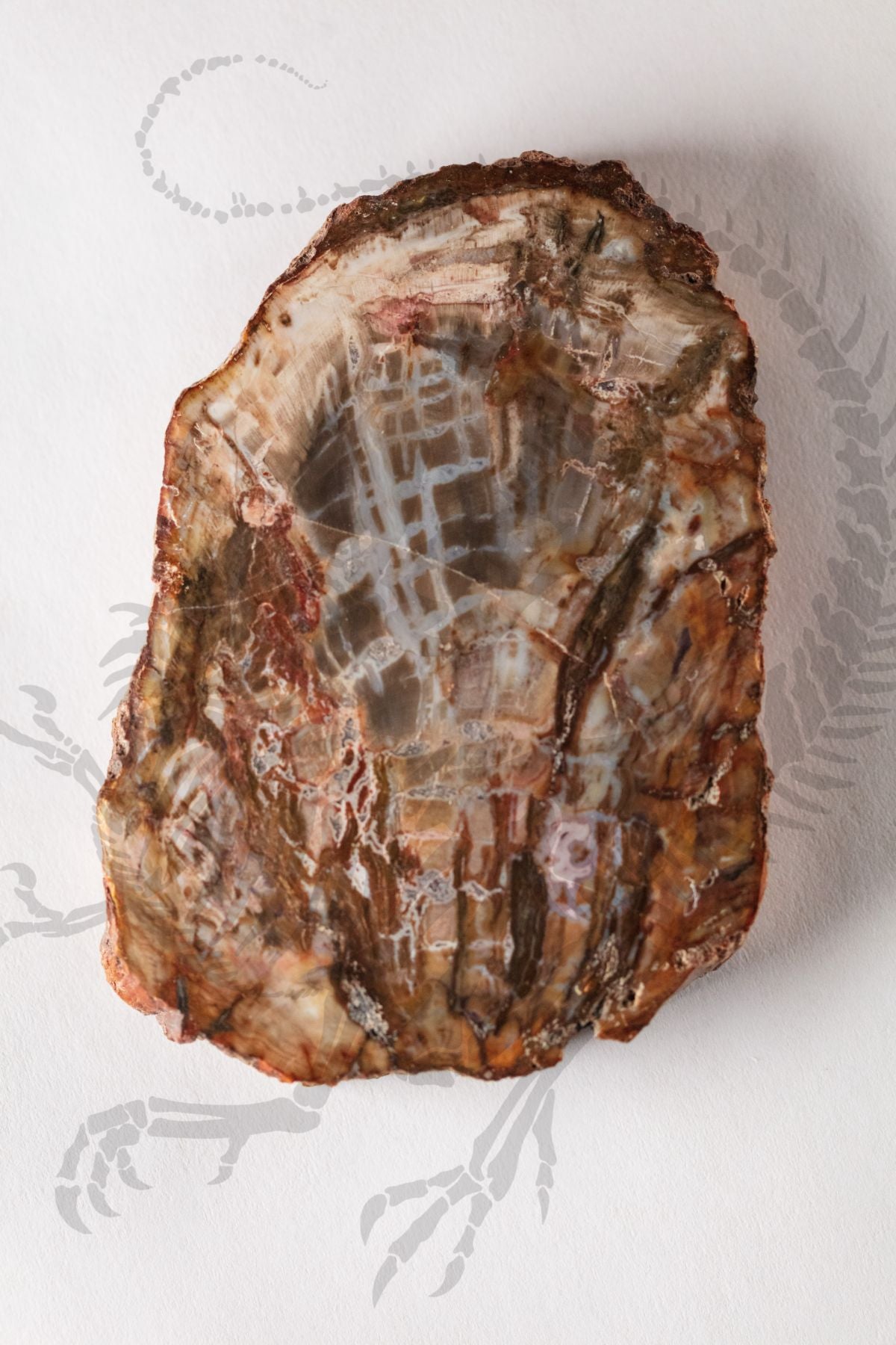These stunning polished slices of petrified wood from Madagascar have such stunning colors and patterns thanks to the naturally occurring agate and quartz fossilization process, the crystals of these minerals "petrifying" the wood. Petrified wood may not be exact ones pictured and will vary in color and pattern. Petrified wood is the fossilized remains of land based vegetation, namely trees. Trees first appeared on the planet about 350 million years ago, and remains of this flora are still some of the more common fossil plant remnants, The organic material within the wood is often replaced by standard surrounding sedimentary rock, but can also be intruded by gem stones or minerals such as quartz, chalcedony, or even opal.