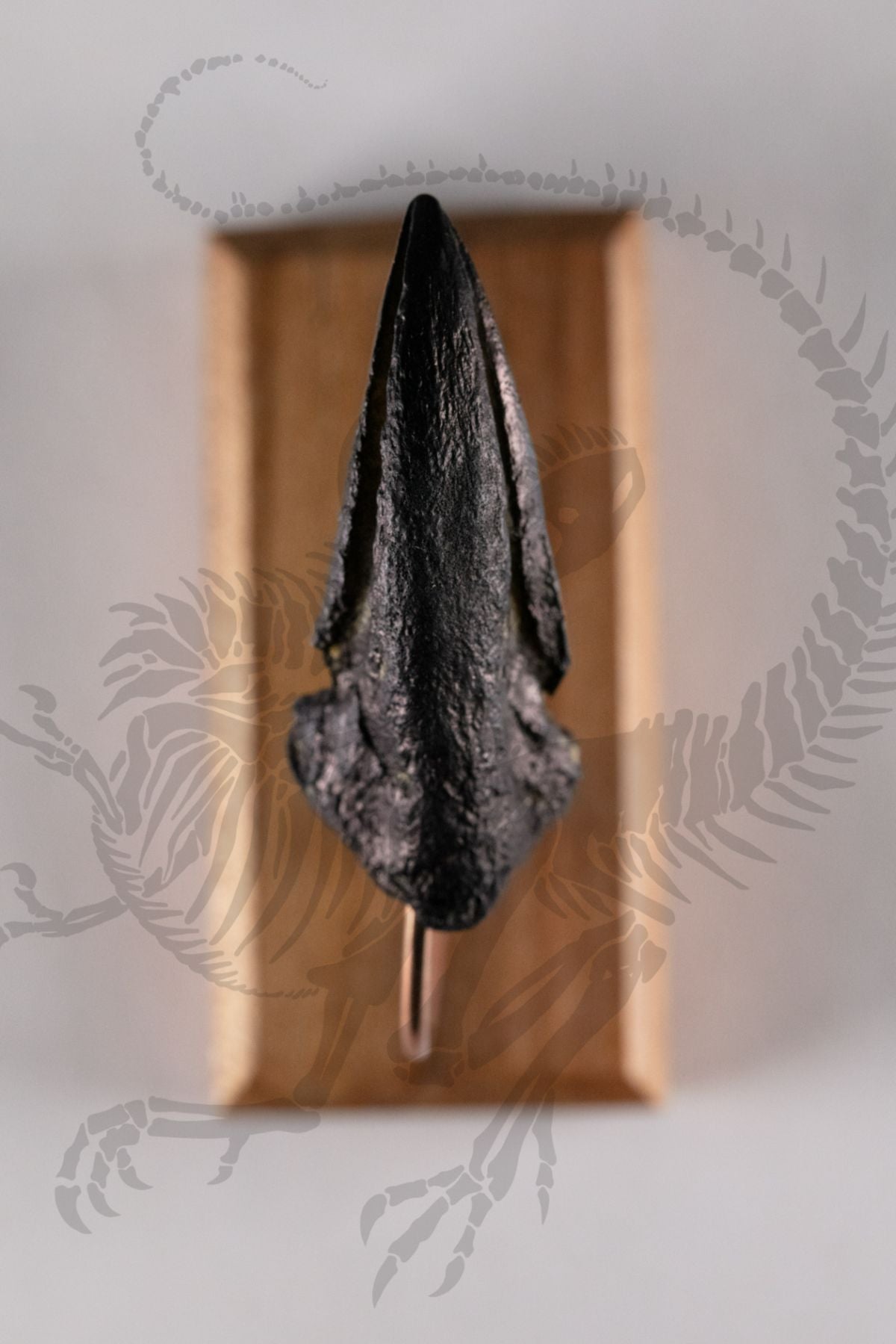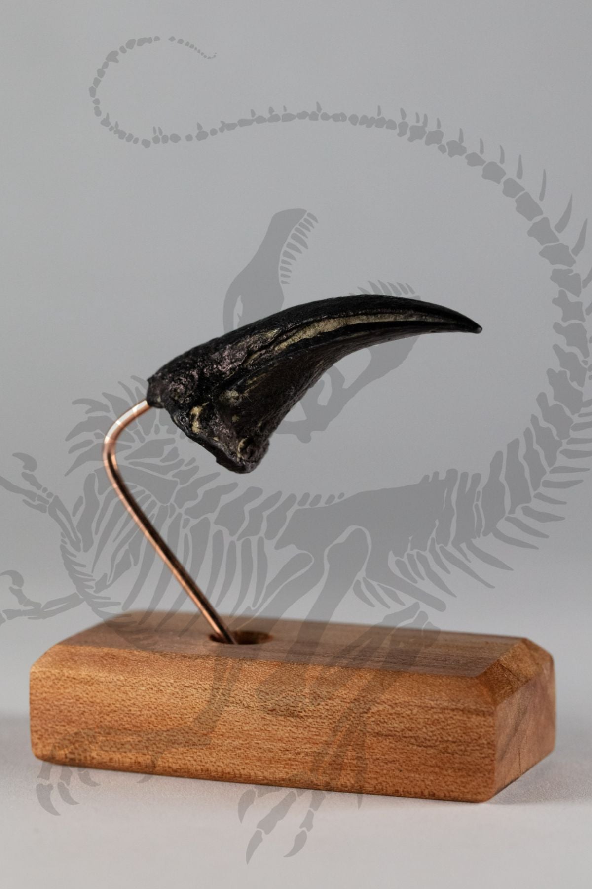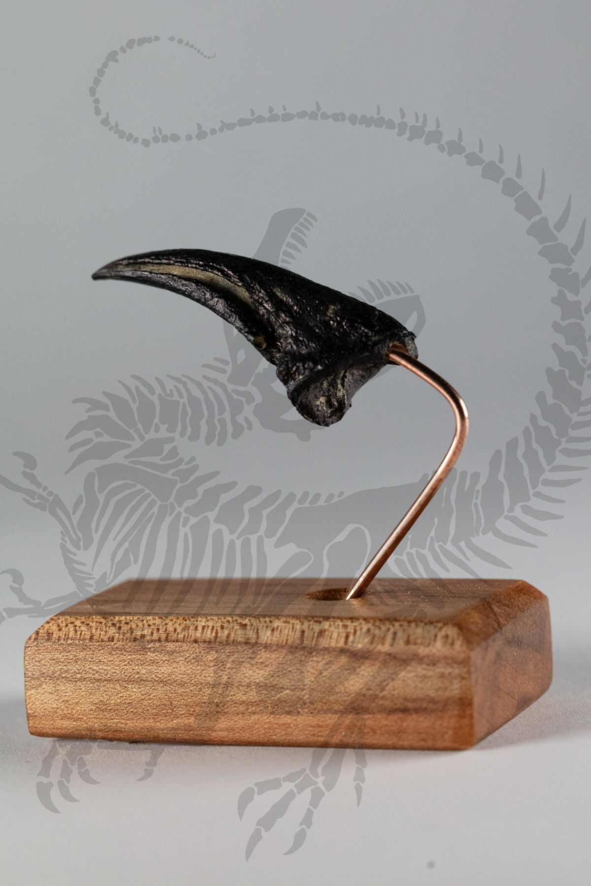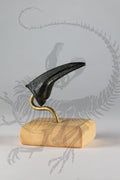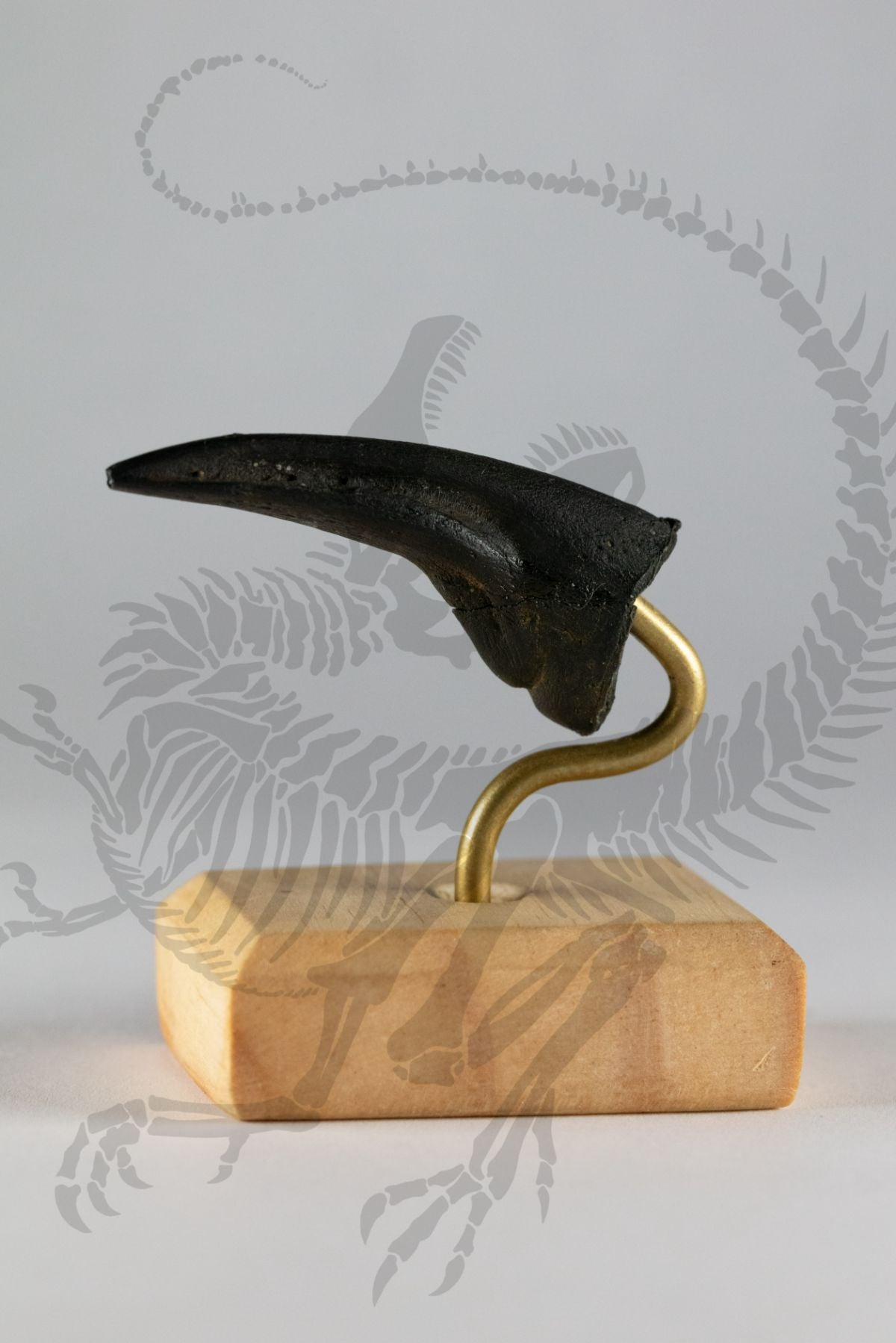 This elegant claw cast was molded off of a real claw belonging to the Jurassic age, Dryosaurus. Much like a gazelle, this beautiful herbivorous dinosaur likely relied on speed and numbers for safety. Comes on a custom hardwood stand, wood type and color may vary. Dryosaurus was a small North American herbivore from the late Jurassic Period, about 145 million years ago. Its jaws were efficient food processors, using a hard beak to slice plants and teeth within the cheeks to grind it easily. At about 14 feet long, 5 feet tall, and about 200 pounds, this long legged, stiff tailed plant eater most likely used its speed to escape larger predators.