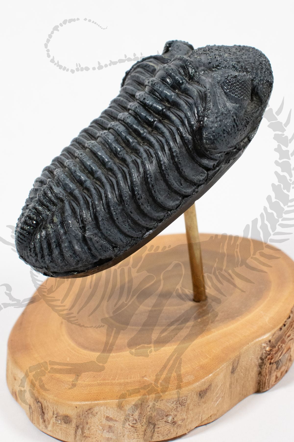 The massive real trilobite this cast was molded off of was so exquisitely preserved you can even see all the details of it's eyes! Comes on a custom hardwood stand. Trilobites are an extinct arthropod appeared in the Cambrian period, over 520 million years ago. Named for the three vertical lobes that make up their body, these creatures were also the first animals to evolve complex eyes. Extremely successful animals in their environments, the thousands of species make up the most common fossils on earth. They most likely ate small soft organisms like worms or sifted through the sand to find organic particulates.