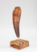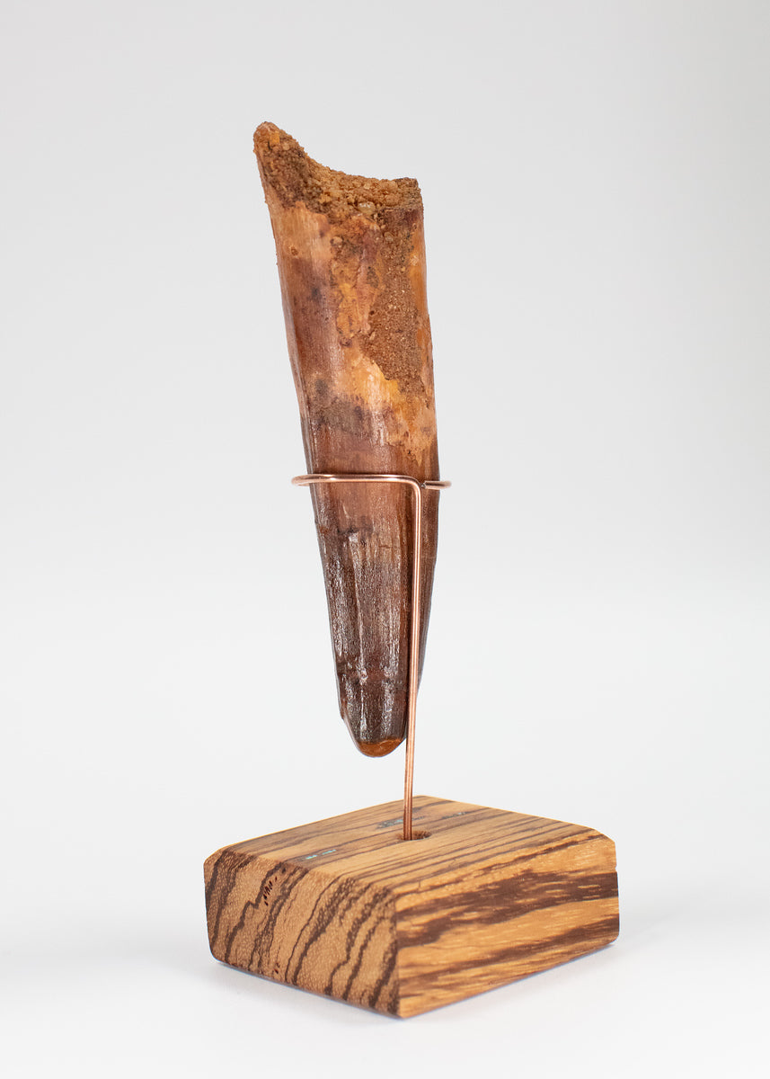 Authentic, absolutely massive tooth, belonging to possibly the longest of all carnivorous dinosaurs, Spinosaurus, from the Kem Kem Beds of Morocco. An imposing real fossil from one of the most iconic predatory dinosaurs. Thanks to its giant size, beautiful enamel, and imposing shape, one can easily see why stunning teeth such as this helped make Spinosaurus infamous to this day. Includes a hardwood stand. Spinosaurus was a giant predator from the Mid Cretaceous period in Northern Africa. Despite being the longest predatory dinosaur, at over 50 feet long, it was not the biggest. Other carnivores such as T. rex or its contemporary, Carcharodontosaurus outweighed it. Spinosaurus was likely primarily aquatic, using its tail fin, short hind limbs, flattened feet, and crocodilian like snout to hunt fish. The purpose of the large neural spines on its back that gives Spinosaurus its name and form a sail is still unknown.