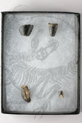 These four teeth were all recovered from Wyoming, USA in a quarry dating to the Late Jurassic Period. All four teeth are 100% authentic, and come from the same ecosystem. The teeth belong to the apex predator, Allosaurus, the prehistoric crocodylomorph, Goniopholis, the elegant long-necked Diplodocus, and the truly massive Camarasaurus. Allosaurus was a large predator from the North American Jurassic period, living about 145 million years ago. It’s been proposed it lived in groups, using numbers, massive claws, and blade like teeth to take down prey many times larger than itself. Allosaurus was by far the most successful theropod in its environment, several dozen specimens have been recovered by paleontologists, and is Utah’s own state fossil! Goniopholis was a prehistoric species of extinct crocodilian that appeared in North America during the Jurassic Period, about 145 million years ago. It did not however go extinct until the early Cretaceous, about 110 million years ago. It is strikingly similar to its later cousins, Nile Crocodiles and American Alligators, and likely lived a very similar lifestyle. It could get nearly 15 feet long, and like its modern relatives, was a semi-aquatic ambush predator. Diplodocus was a giant herbivorous sauropod dinosaur, existing throughout much of the United States in the Late Jurassic, about 145 million years ago, It got nearly 90 feet long, and unlike some of its distant cousins like Brachiosaurus, was far longer than it was tall. We also know thanks to skin impressions that Diplodocus probably had large iguana like spikes running from its neck to its giant whip-like tail.