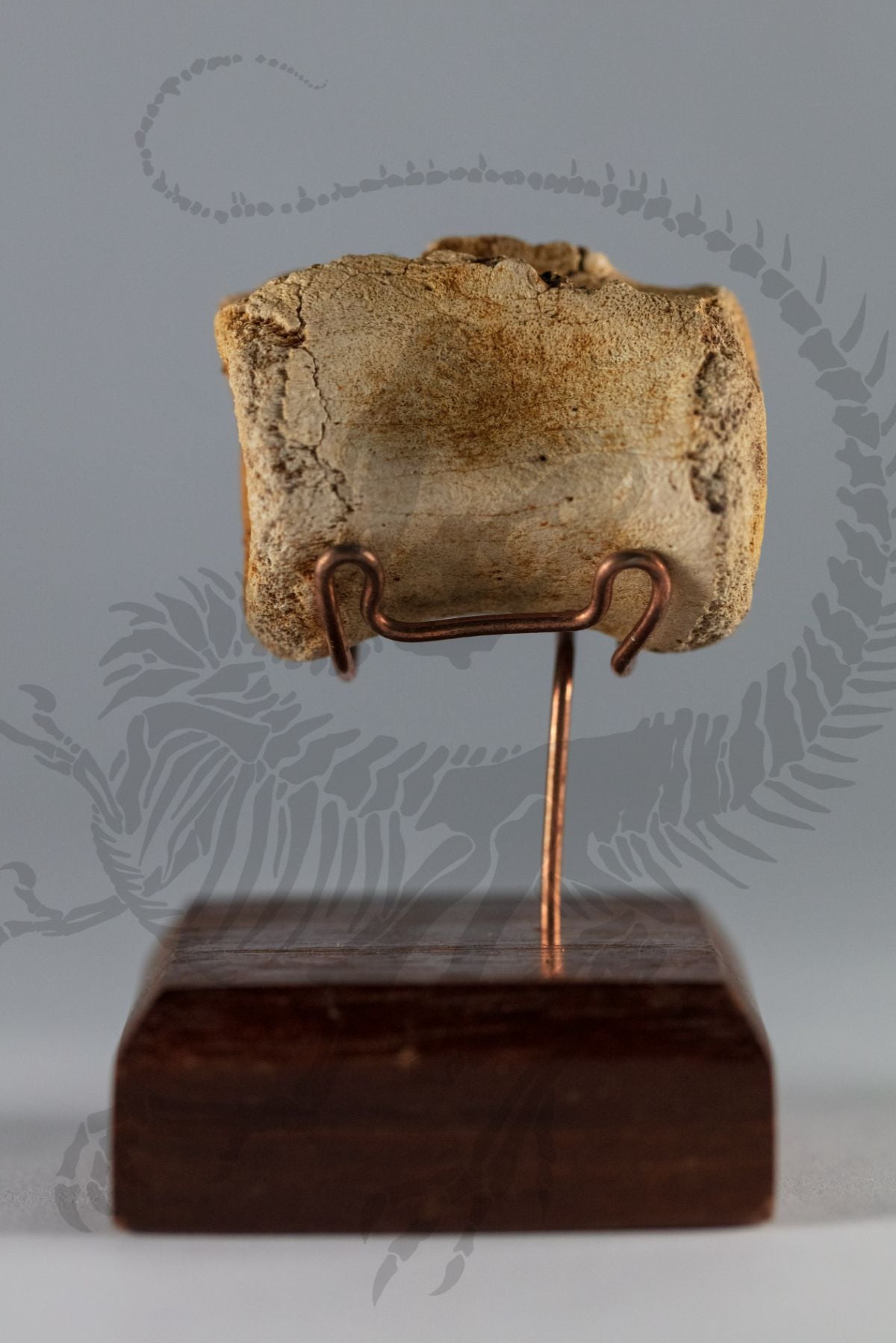 Authentic caudal (tail) vertebra to the iconic and distinctive dome-headed dinosaur, Pachycephalosaurus from the Lance Formation rock of Wyoming, USA. This beautiful real fossil bone has zero restoration and is an amazing piece of such a strange and well known dinosaur. Comes with a custom hardwood stand. Pachycephalosaurus was a small herbivorous dinosaur from the Late Cretaceous period of North America, living about 66 million years ago. Pachycephalosaurus was a robust animal, despite being about 5 feet tall and 15 feet long, it may have weighed up to nearly 1,000 pounds. Its bizarre dome-shaped skull was over 10 inches thick and built for head-butting. This behavior was most likely utilized somewhat in self defense, but most commonly in combat between rivals of their own species.