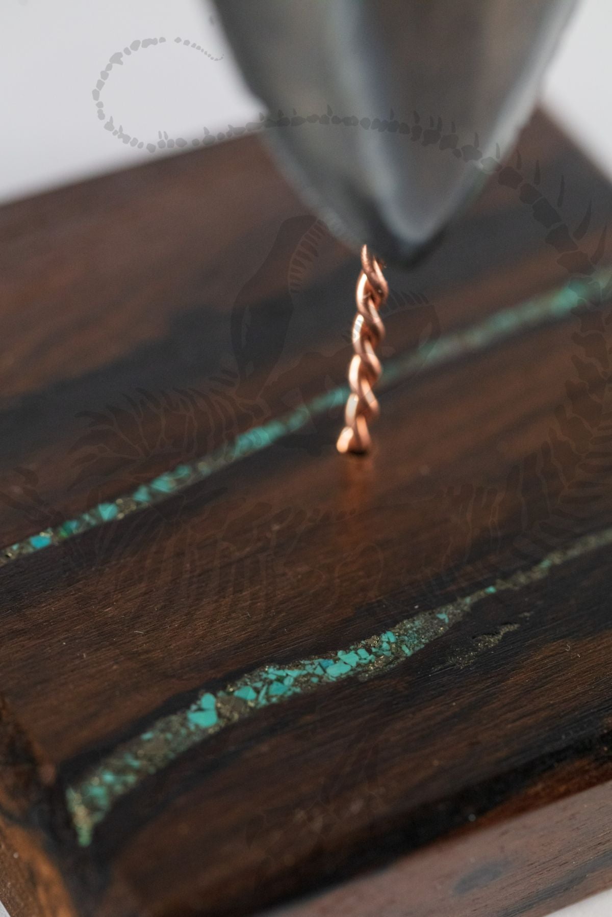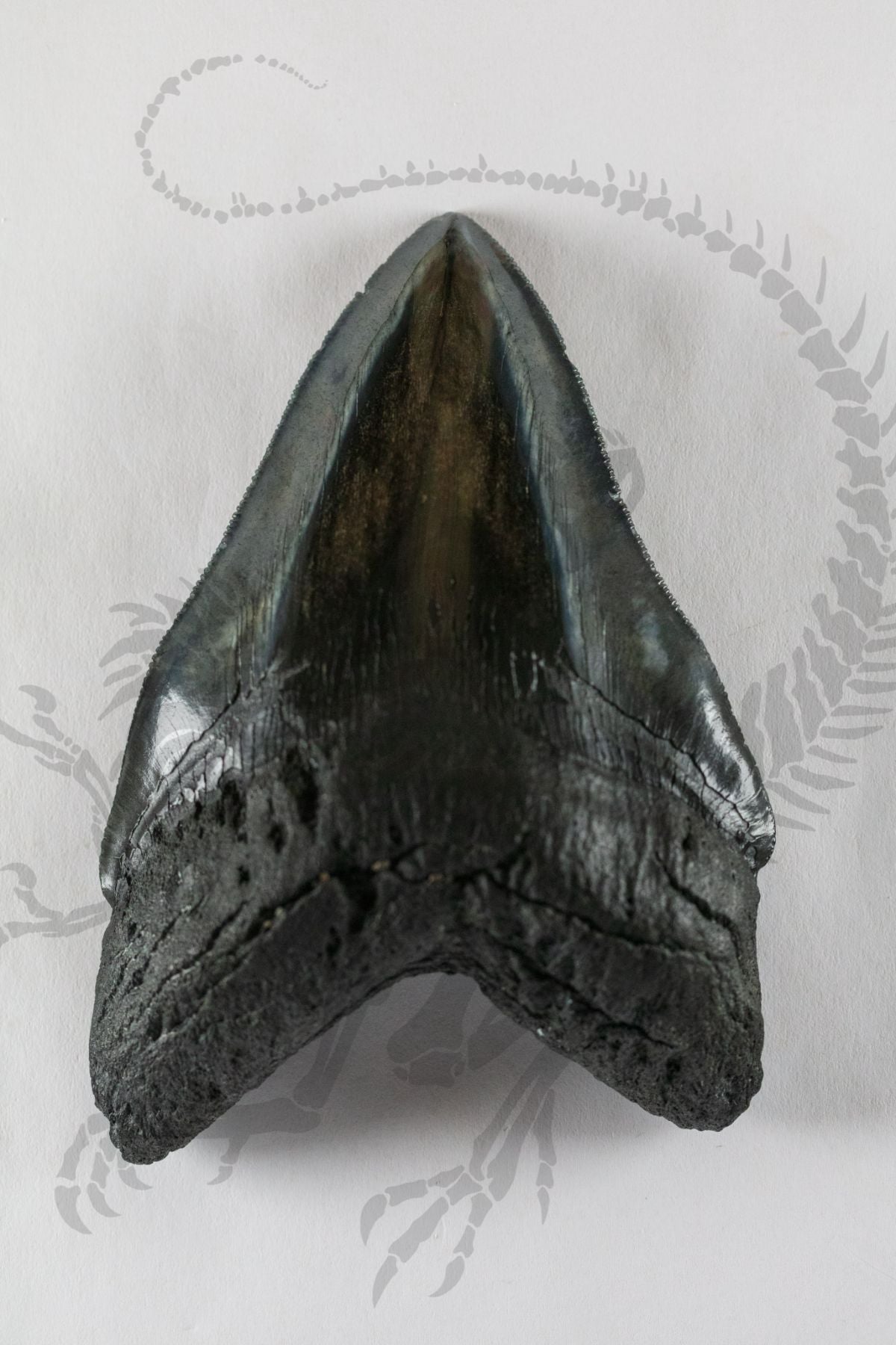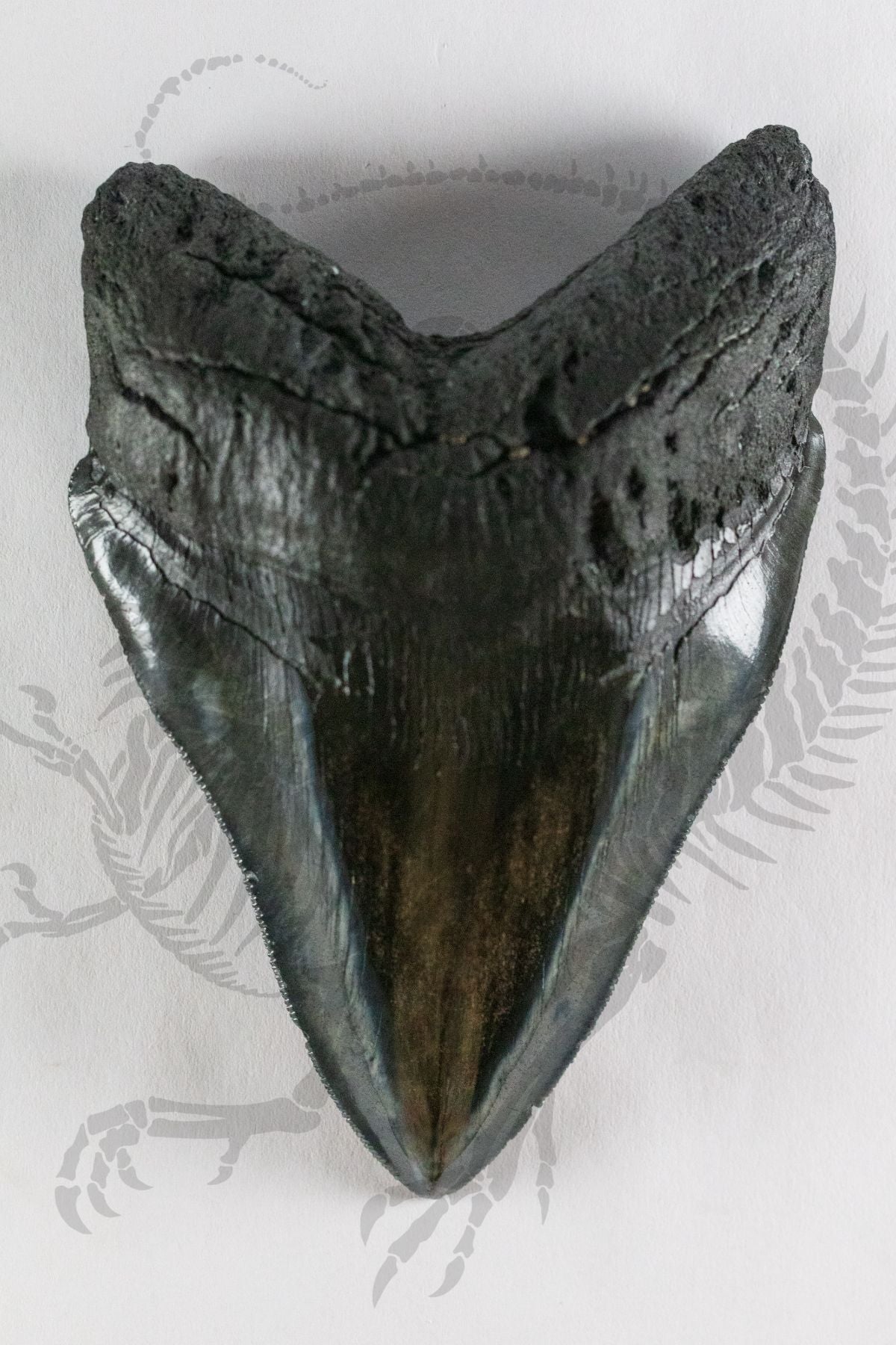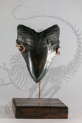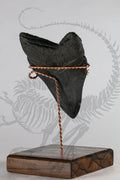 This stunning massive Megalodon tooth was recovered from the seas off the coast of South Carolina. During the fossilization process it was naturally intruded with the precious mineral, pyrite, leaving this gorgeous tooth with a gold flash down the center. At a huge length of over 5" and complete with perfect serrations, this is an incredible piece for any collection or display. The tooth comes on a beautiful hardwood stand that has a turquoise and pyrite inlay, matching the preservation of the tooth. Megalodon was a giant species of shark that swam the seas of Europe, North and South America, Africa, and Australia during the Miocene to Pliocene, dying out about 3 million years ago. Despite its iconic status, we know very little about the predator, lacking any skeletal material besides the teeth. Even the jaw bones have never been found. While some estimates put Megalodon at 80+ feet in length, new studies have brought it in at a more conservative 42 feet long.