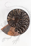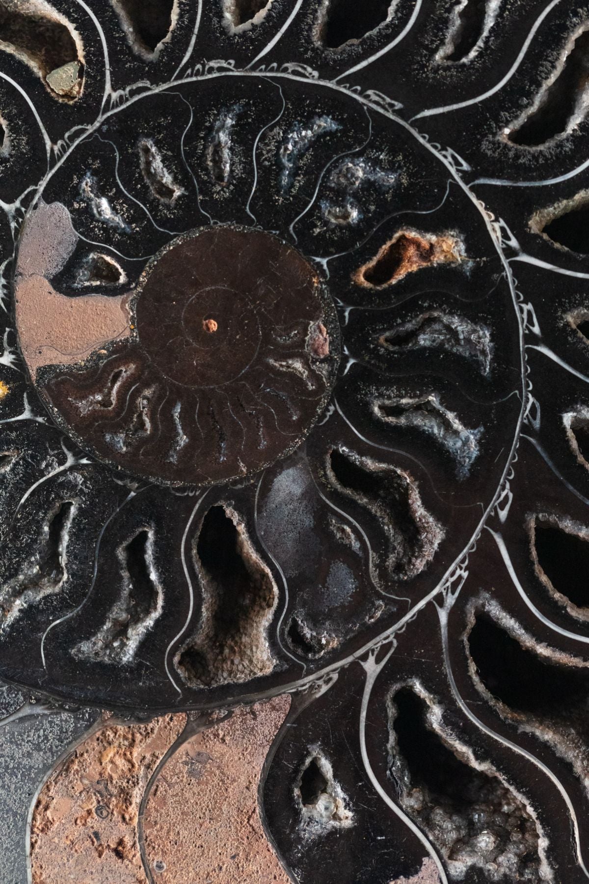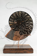 This huge beautiful Perisphinctes Ammonite was found on the African island of Madagascar and is stunningly preserved with zero restoration. Naturally fossilized in the agate beds it was deposited in, the precious stone intruded the hollow chambers of the fossil. This led to a rare black agate preservation that has been polished on one side so the viewer can admire the stunning interior structure of the Ammonite as well as the striking uncommon jet black coloration. Comes with a custom hardwood stand. Wood type and color may vary. Ammonites were prehistoric extinct cephalopods that went extinct about 65 million years ago. An incredibly long lived group of animals, ammonites appeared on the planet about 400 million years ago, but only went extinct the same time the dinosaurs did. Ammonites were also very diverse, with a plethora of spiral shells and ranging in size from a few inches to nearly 5 feet across! Despite looking similar to the modern Nautilus, they are more closely related to an Octopus.