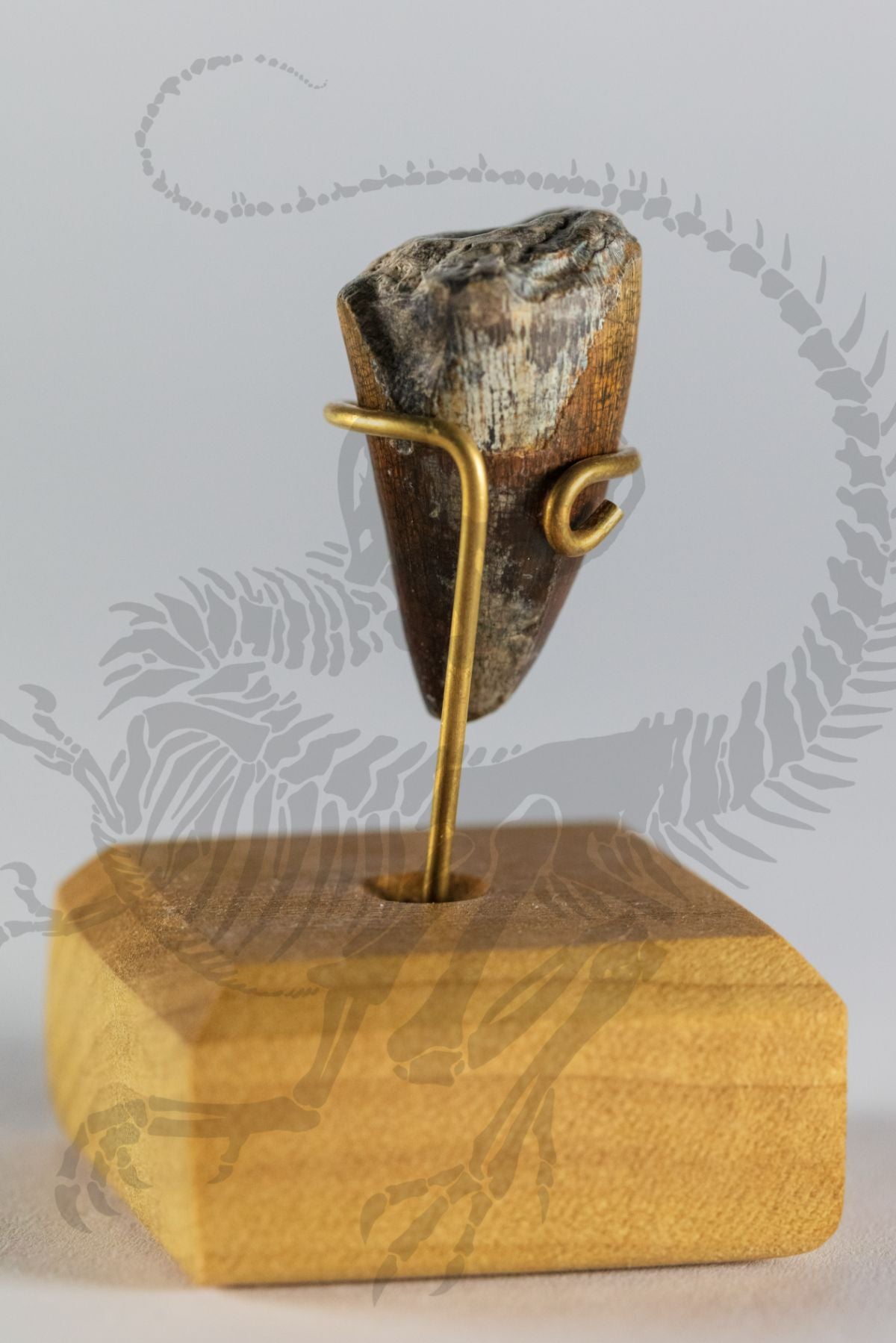 Authentic fossil tooth to the giant crocodilian, Sarcosuchus imperator. This huge conical tooth is not only beautifully preserved but has an incredible color gradient running its entire length. This amazing piece is a testament to the intimidating and voracious nature of this giant aquatic carnivore, who would've been the apex predator of its environment. Comes with a custom made hardwood stand. Sarcosuchus was a large African crocodilian from the Early Cretaceous Period, about 112 mya. A massive marine monster, Sarcosuchus could stretch over 30 feet long & weigh nearly 5 tons. The bulbous snout (or bulla) of this animal resembles a display structure found today on male gharials; but the bulla is present on every Sarcosuchus skull known, implying both sexes possessed it & leaving its purpose unknown. The long slender jaws & uniquely flat & plate-like armor of Sarcosuchus allowed it to snap up the prey of its time, from fish to dinosaurs.