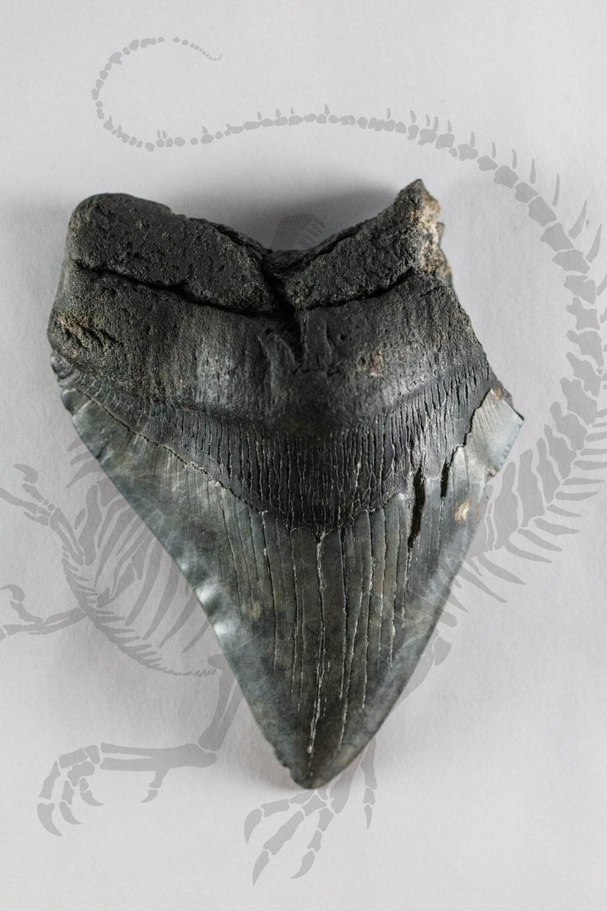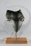 This stunning massive Megalodon tooth was recovered from the seas off the coast of South Carolina. At a huge length of over 4" and complete with stunning serrations, this is an incredible piece for any collection or display. One side of the root of this tooth was sheared off, adding to the incredible history of the piece, as this may have occurred while the animal was still alive; breaking the tooth while hunting or eating. The tooth comes on a beautiful hardwood stand custom made for the piece. Megalodon was a giant species of shark that swam the seas of Europe, North and South America, Africa, and Australia during the Miocene to Pliocene, dying out about 3 million years ago. Despite its iconic status, we know very little about the predator, lacking any skeletal material besides the teeth. Even the jaw bones have never been found. While some estimates put Megalodon at 80+ feet in length, new studies have brought it in at a more conservative 42 feet long.