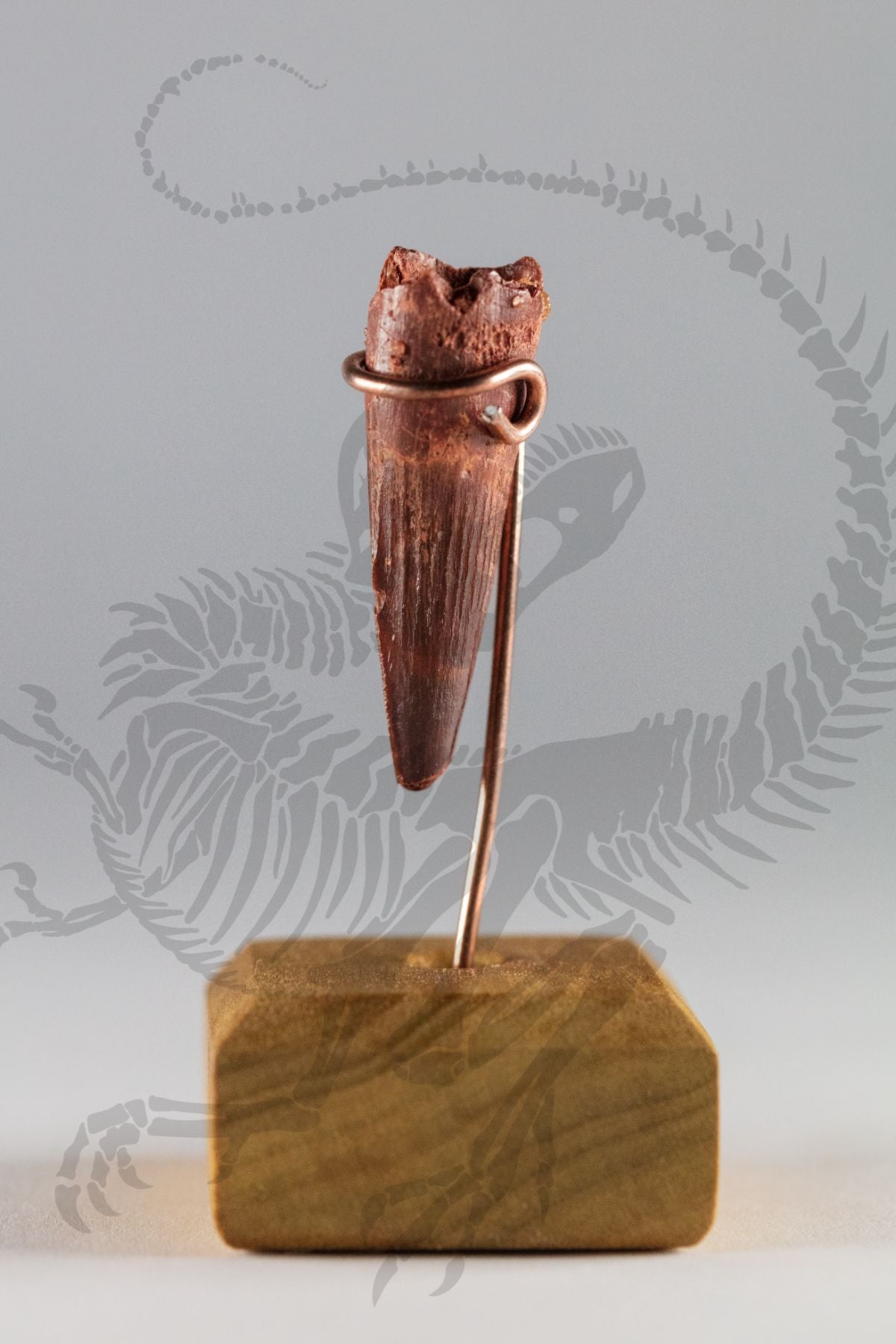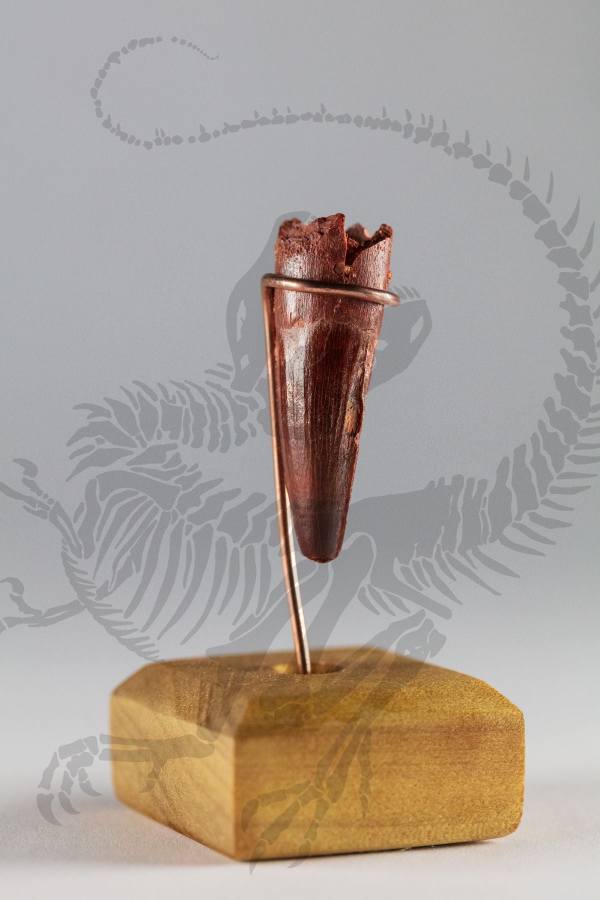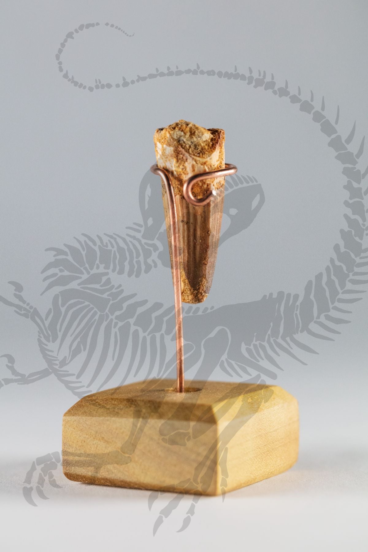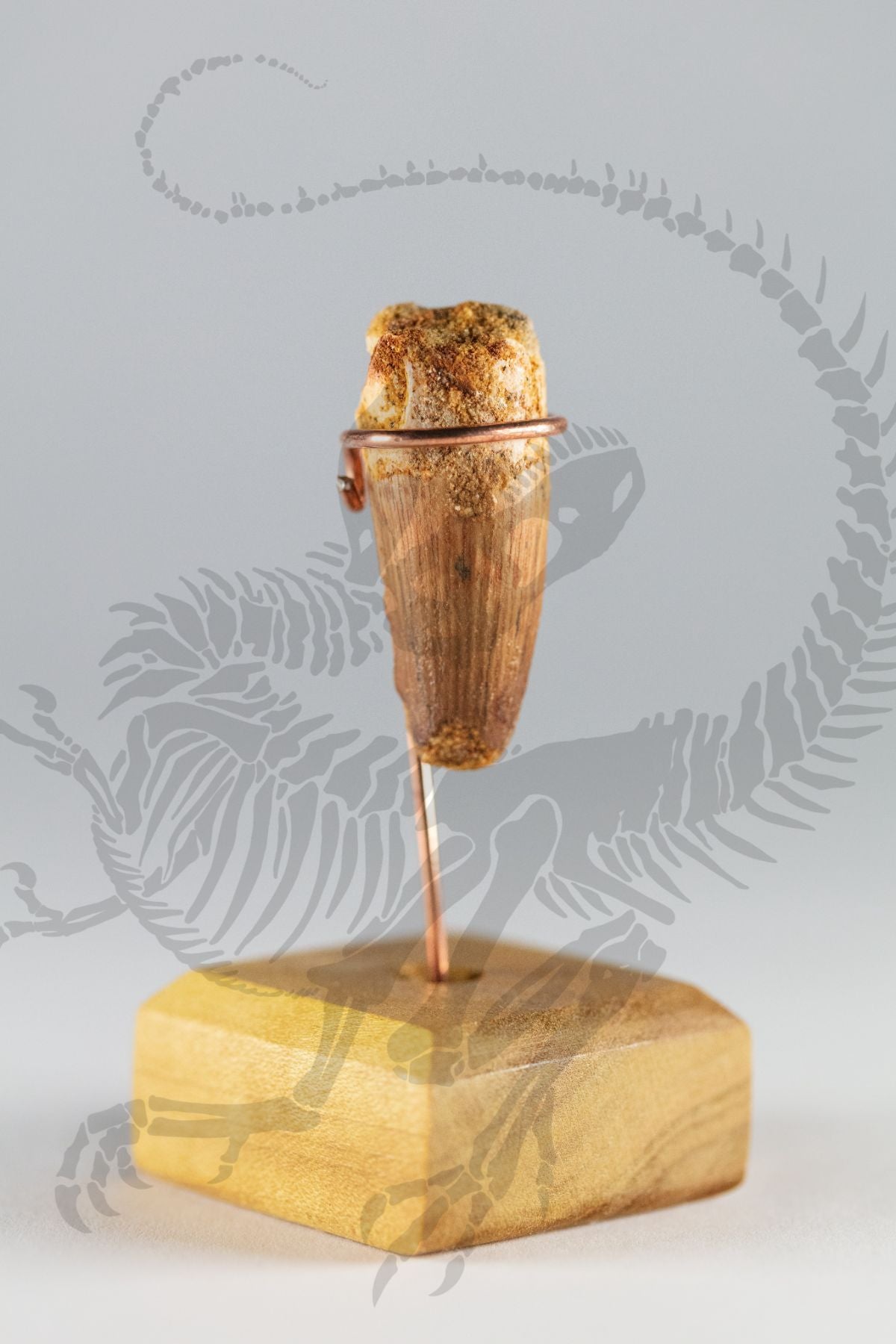 Authentic teeth belonging to possibly the longest of all carnivorous dinosaurs, Spinosaurus, from the Kem Kem Beds of Morocco. An imposing real fossil from one of the most iconic predatory dinosaurs. Teeth will vary in size, look, and shape. Includes a hardwood stand of varying wood type and color. Spinosaurus was a giant predator from the Mid Cretaceous period in Northern Africa. Despite being the longest predatory dinosaur, at over 50 feet long, it was not the biggest. Other carnivores such as T. rex or its contemporary, Carcharodontosaurus outweighed it. Spinosaurus was likely primarily aquatic, using its tail fin, short hind limbs, flattened feet, and crocodilian like snout to hunt fish. The purpose of the large neural spines on its back that gives Spinosaurus its name and form a sail is still unknown.