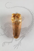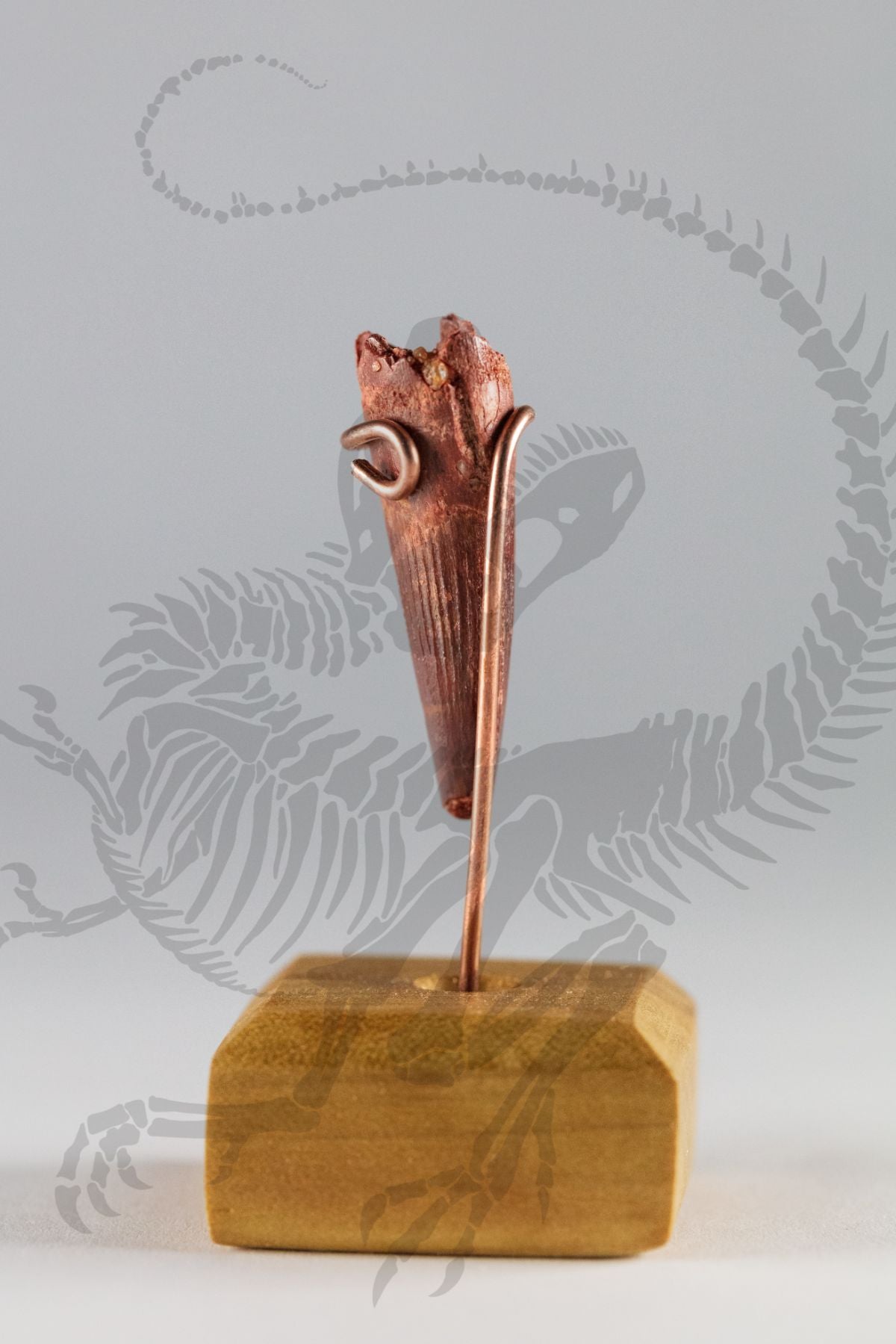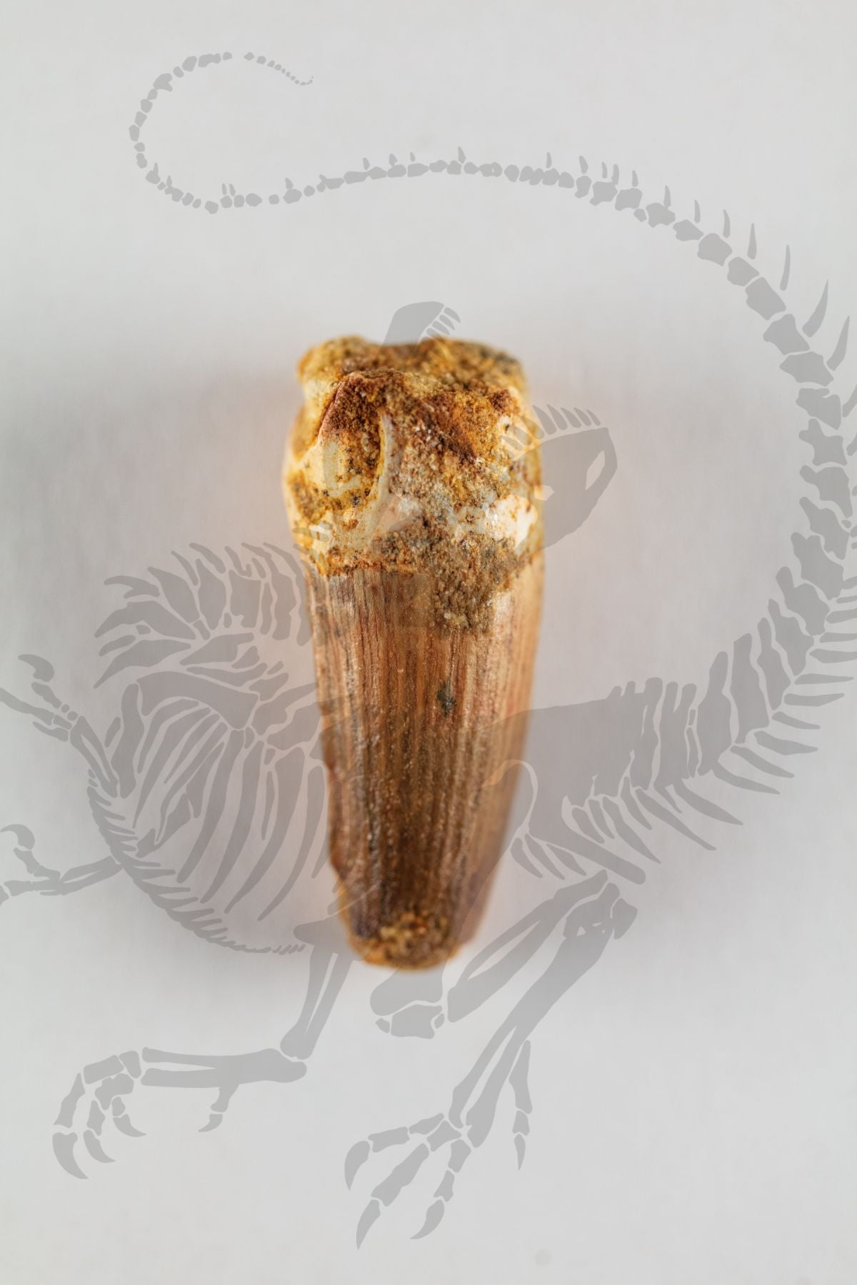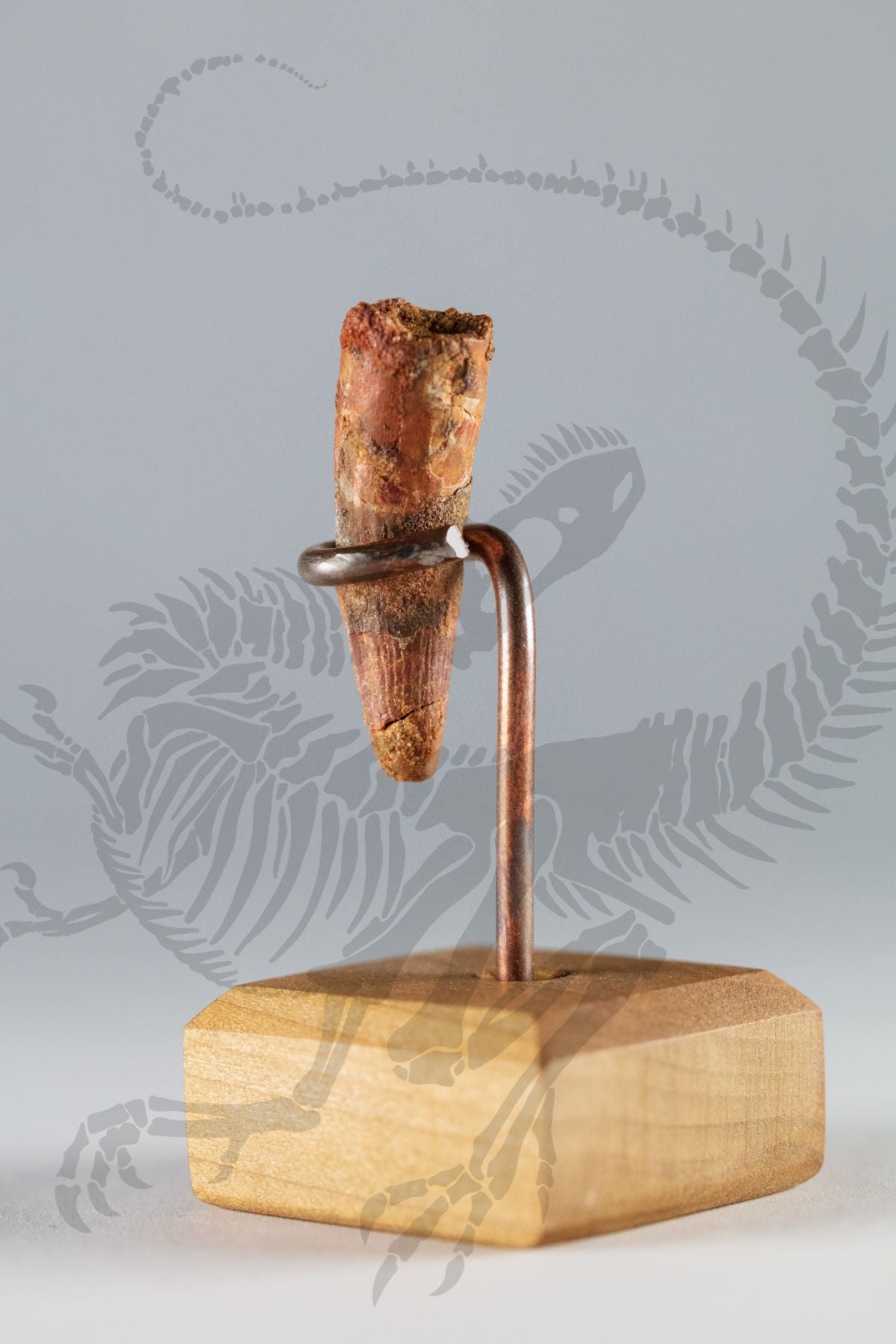Authentic teeth belonging to possibly the longest of all carnivorous dinosaurs, Spinosaurus, from the Kem Kem Beds of Morocco. An imposing real fossil from one of the most iconic predatory dinosaurs. Teeth will vary in size, look, and shape. Includes a hardwood stand of varying wood type and color. Spinosaurus was a giant predator from the Mid Cretaceous period in Northern Africa. Despite being the longest predatory dinosaur, at over 50 feet long, it was not the biggest. Other carnivores such as T. rex or its contemporary, Carcharodontosaurus outweighed it. Spinosaurus was likely primarily aquatic, using its tail fin, short hind limbs, flattened feet, and crocodilian like snout to hunt fish. The purpose of the large neural spines on its back that gives Spinosaurus its name and form a sail is still unknown.