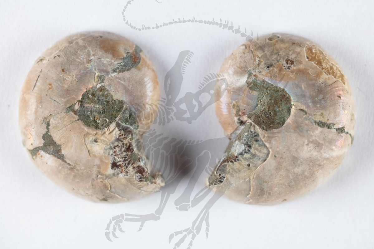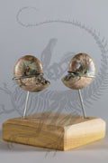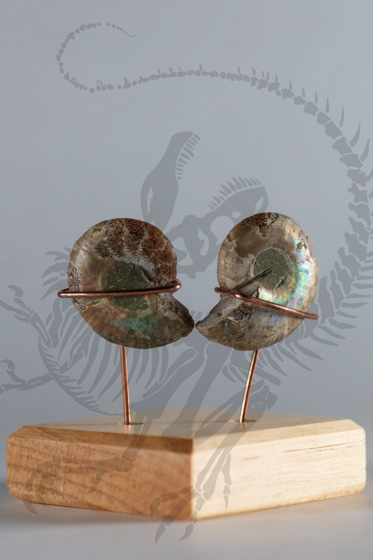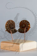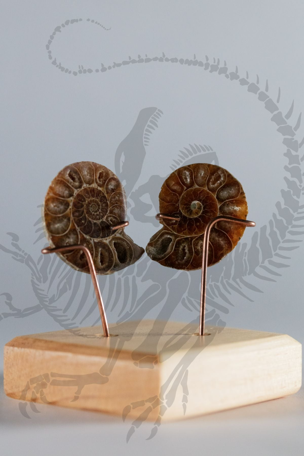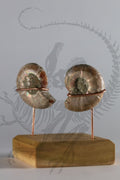 Both ammonite sides are identical in size, each about 1-1.5" across. Approx 3" tall on mount, base dimensions are about 3"x 3".