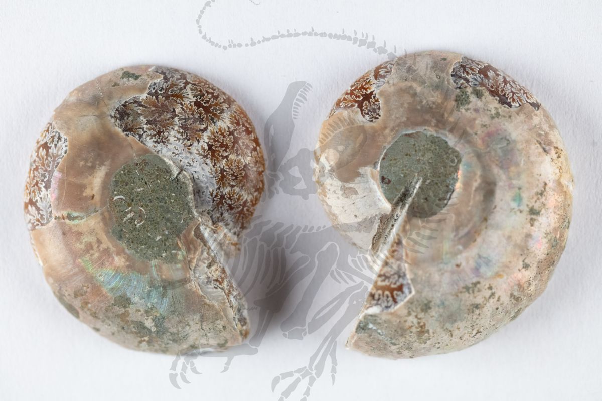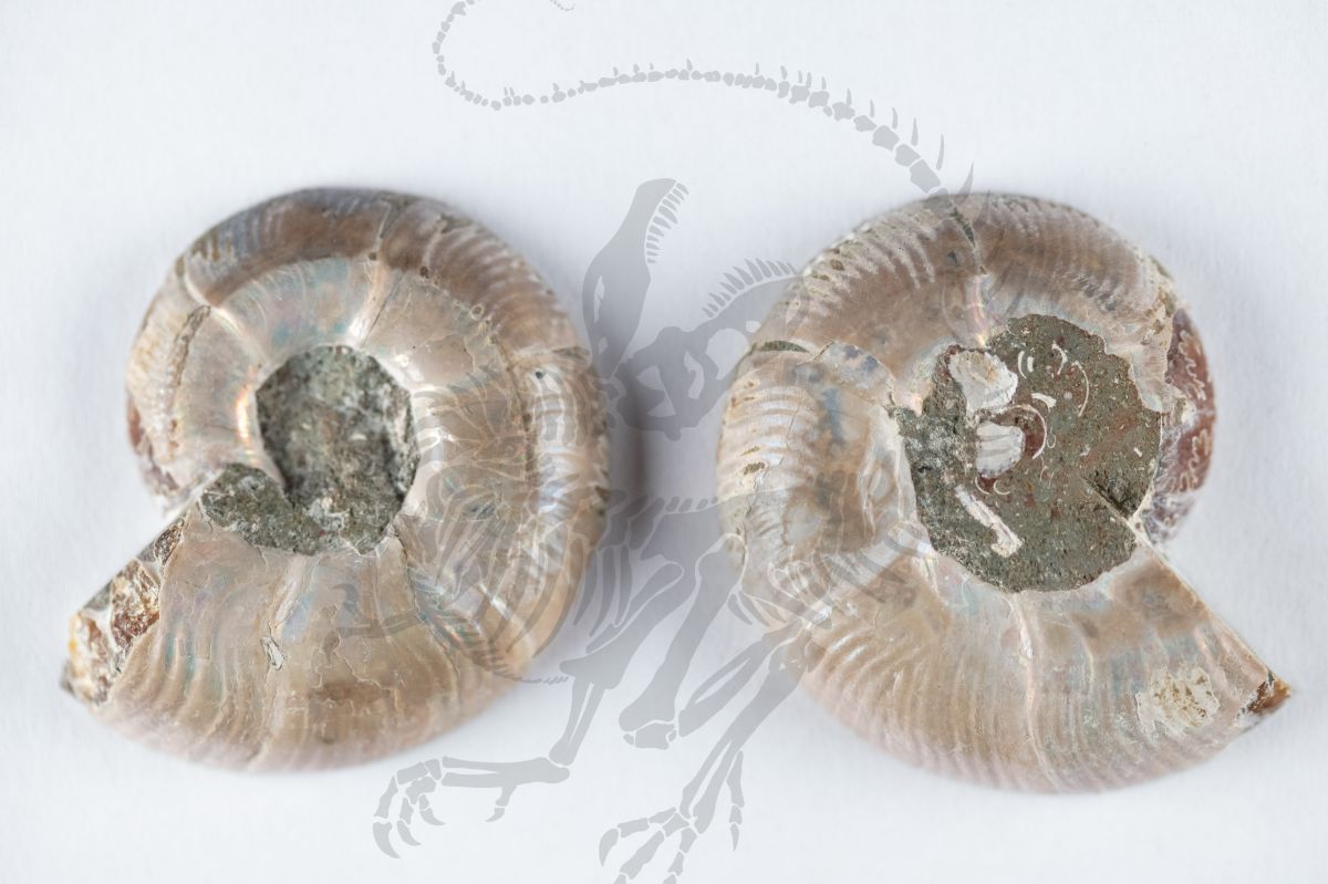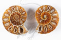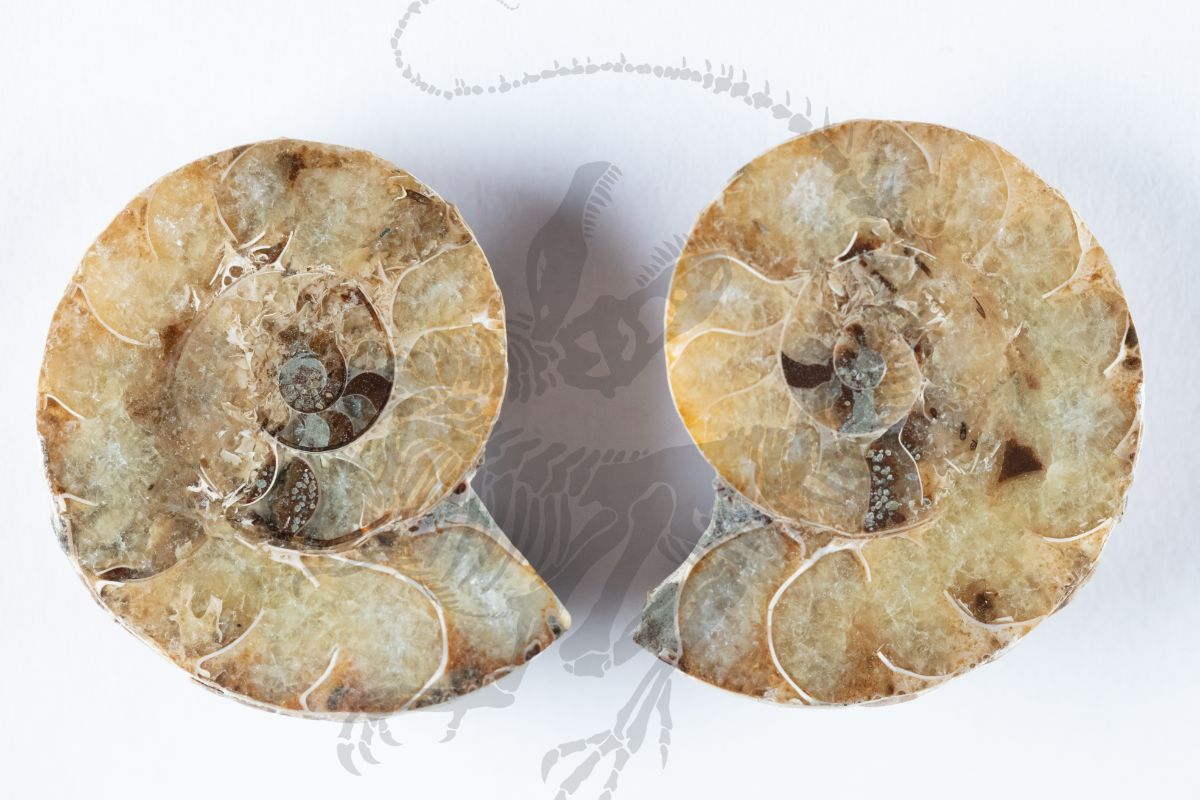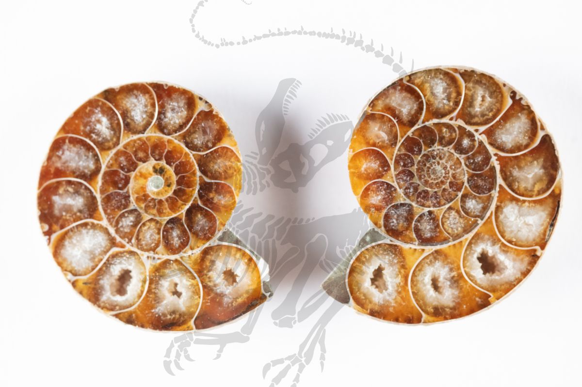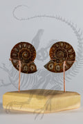 These beautiful Ammonites are found on the African island of Madagascar and are stunningly preserved with zero restoration. They have been split, polished, and mounted with the other half so both the exterior stunning natural side and the gorgeous crystalline interior structure can be admired. Comes with a custom hardwood stand. Wood type and color may vary. Ammonites were prehistoric extinct cephalopods that went extinct about 65 million years ago. An incredibly long lived group of animals, ammonites appeared on the planet about 400 million years ago, but only went extinct the same time the dinosaurs did. Ammonites were also very diverse, with a plethora of spiral shells and ranging in size from a few inches to nearly 5 feet across! Despite looking similar to the modern Nautilus, they are more closely related to an Octopus.