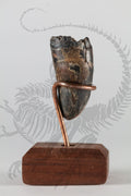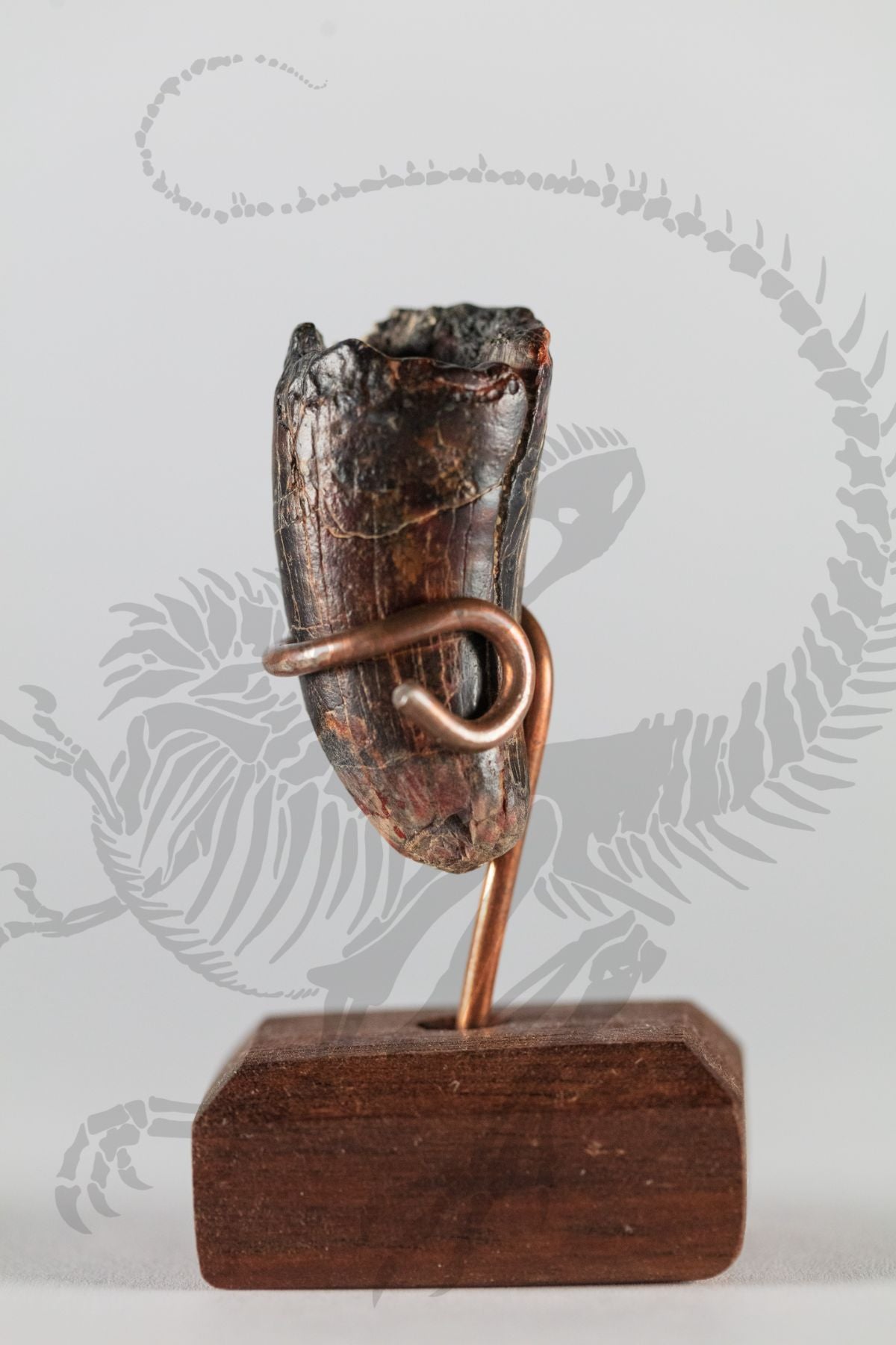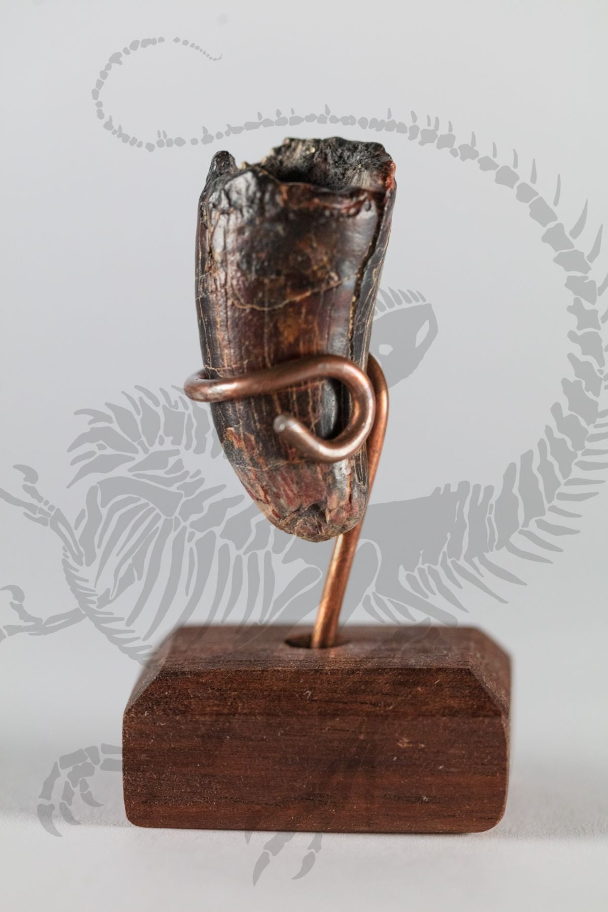 Authentic fossil tooth belonging to the bizarre large carnivorous dinosaur, Suchomimus. The Nigerian sediment this rare fossil was preserved in gave it its distinct black and grey coloration and beautifully intact enamel. A rare tooth belonging to a powerful and intimidating carnivorous dinosaur. Comes on a custom hardwood mount. Suchomimus was a large sized piscivorous dinosaur from Africa in the Early Cretaceous period, about 125 million years ago. At 33 feet long and about 4 tons, it was one of the largest spinosaurids. Similar to its cousin, Spinosaurus, it primarily dined on freshwater and brackish fish, Its crocodile like snout also possessed small holes capable of sensing electric signals put off by fish in the water, allowing it to find prey easily.