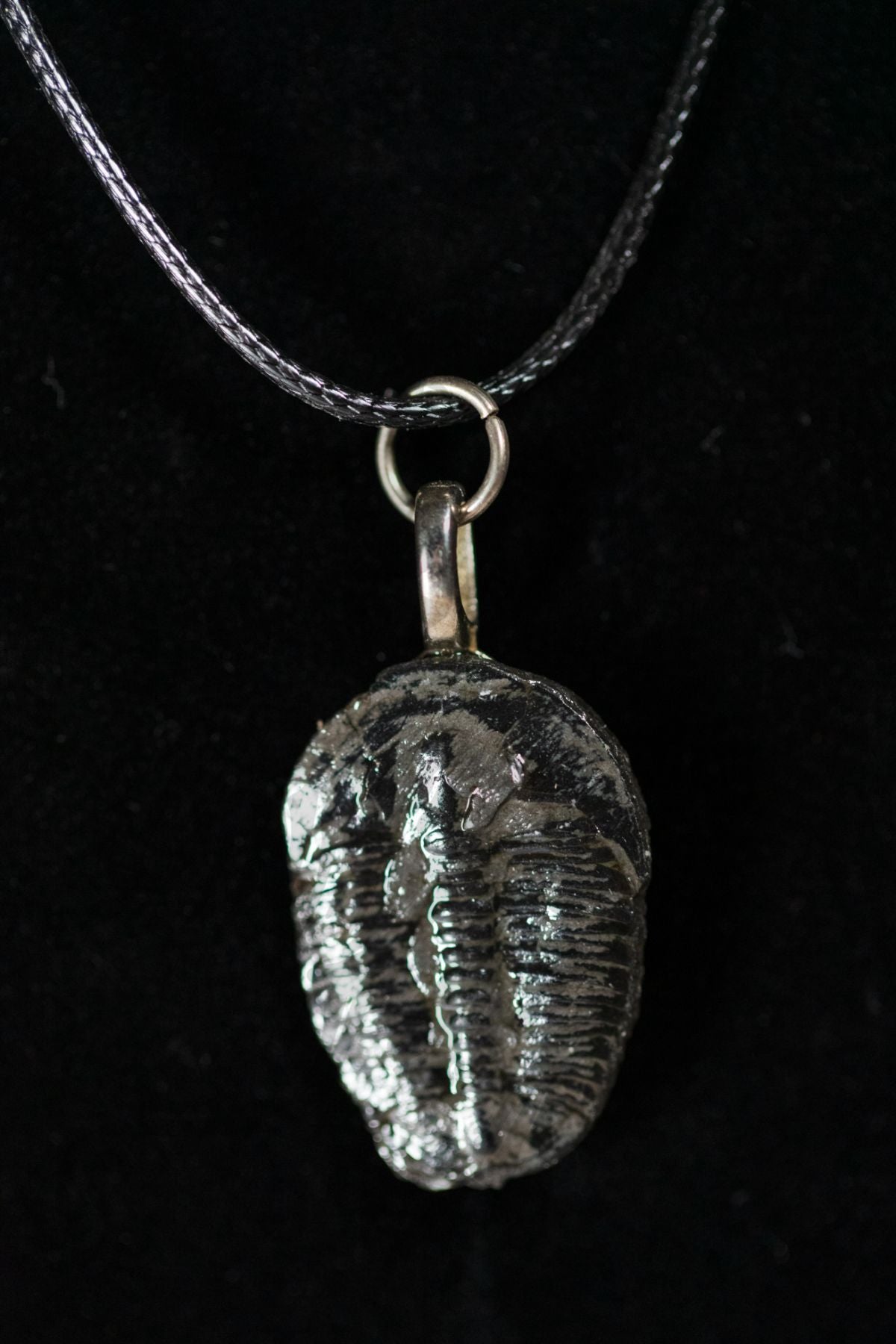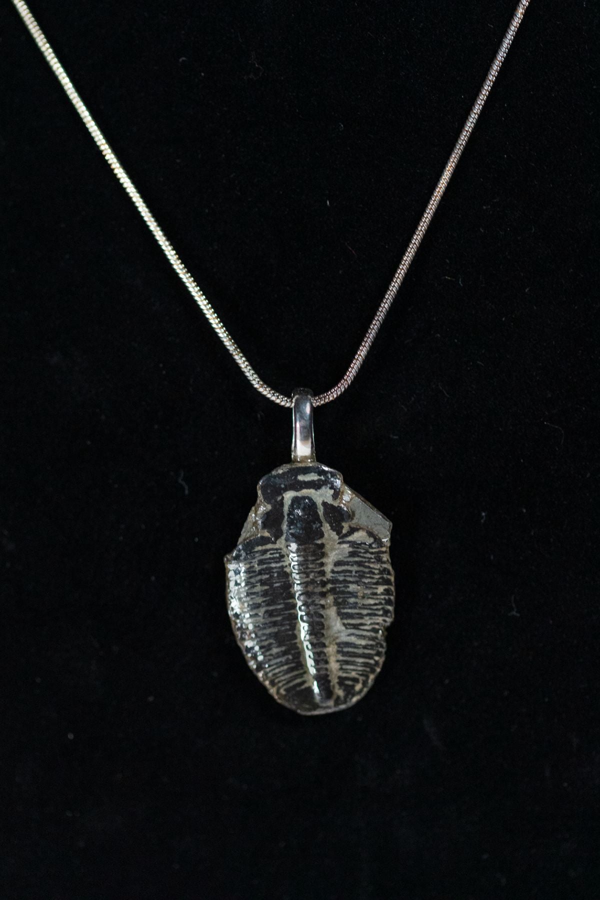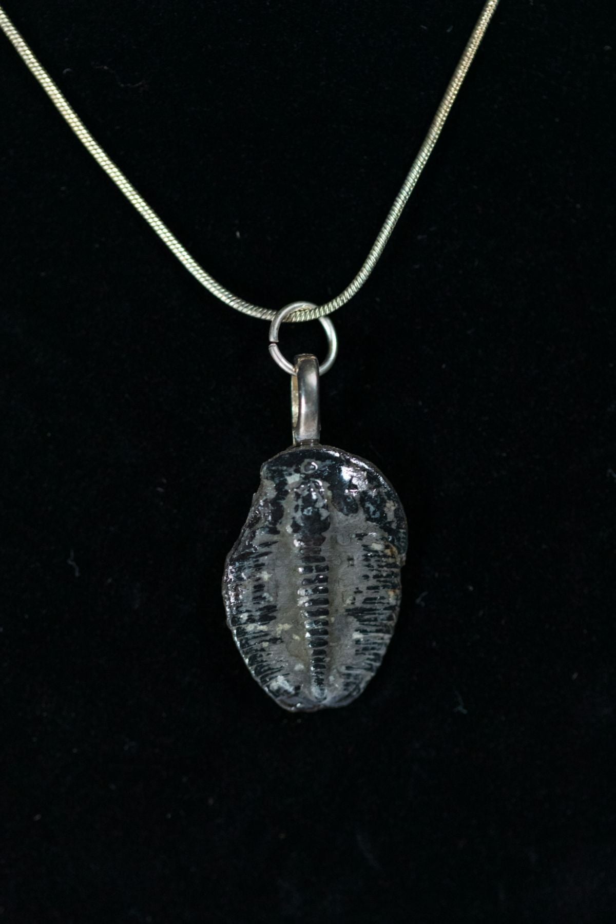 This incredible pendant is made from anreal Trilobite fossil, recovered in Utah, USA. It dates over 400 million years old, allowing the owner to have one of the oldest and most successful of fossil species around their neck. Trilobite fossils are an assortment and will vary in exact shape and size. Trilobites are an extinct arthropod appeared in the Cambrian period, over 520 million years ago. Named for the three vertical lobes that make up their body, these creatures were also the first animals to evolve complex eyes. Extremely successful animals in their environments, the thousands of species make up the most common fossils on earth. They most likely ate small soft organisms like worms or sifted through the sand to find organic particulates.