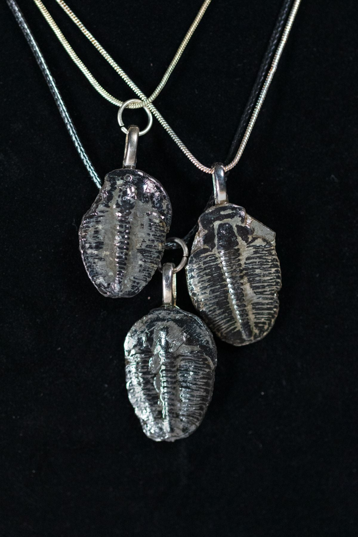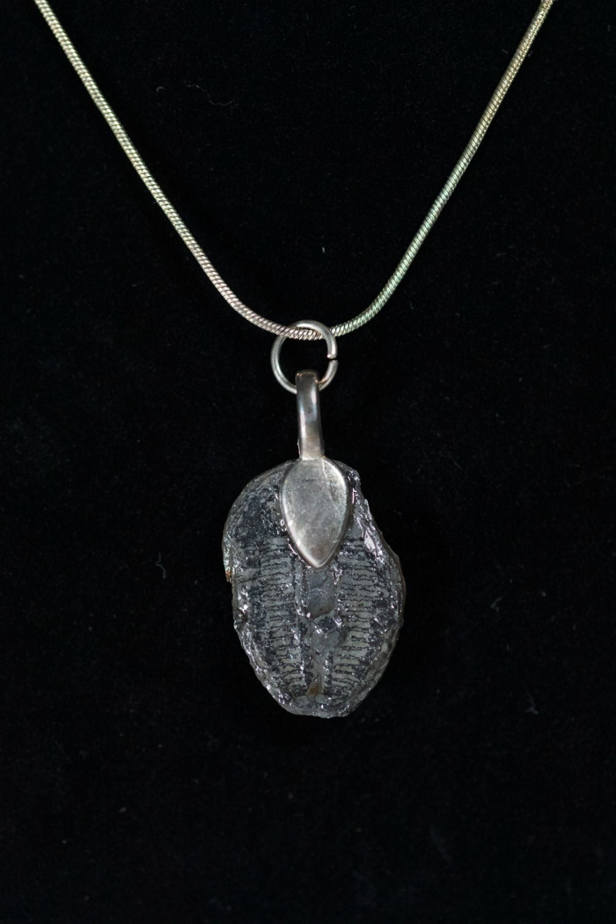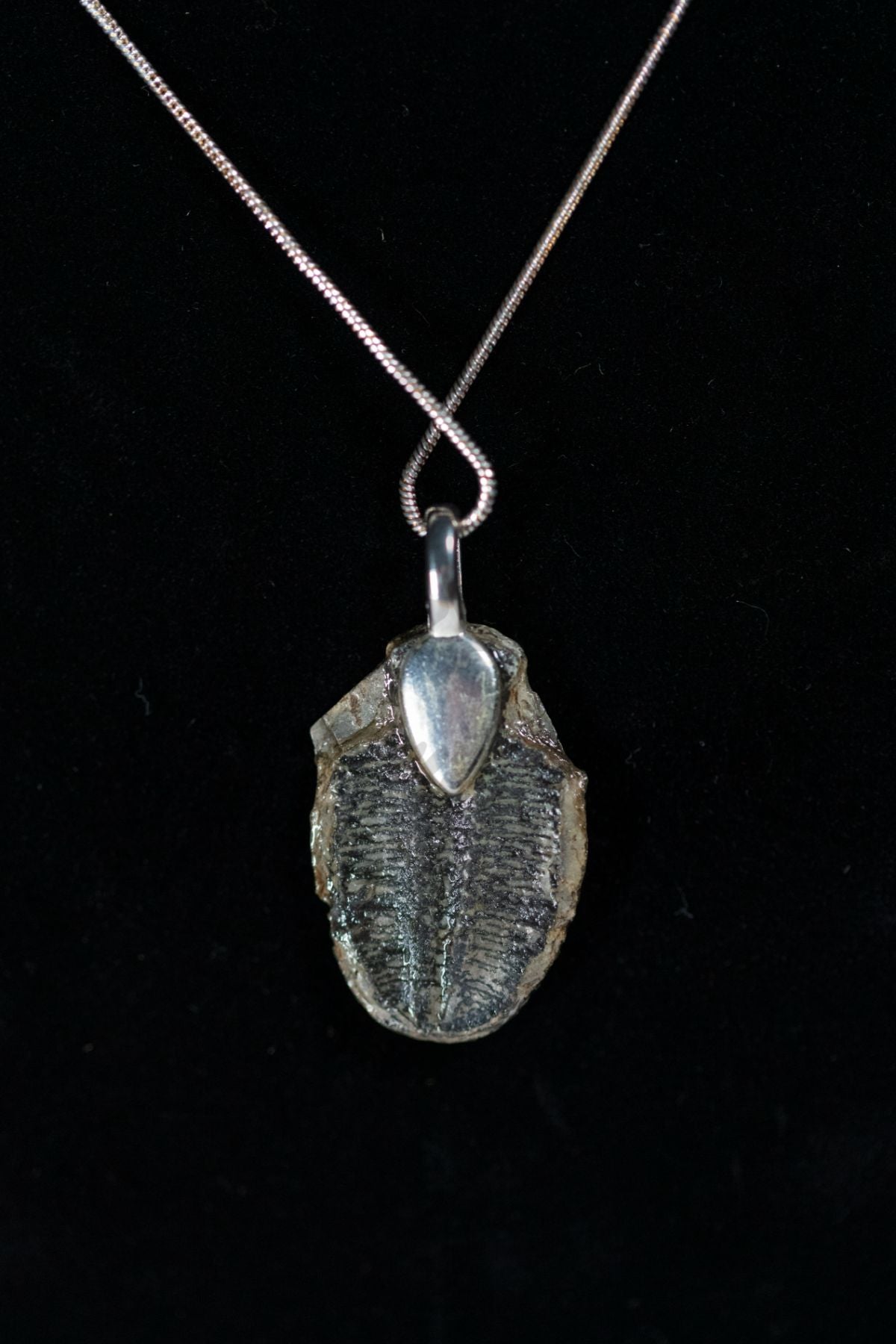 This incredible pendant is made from anreal Trilobite fossil, recovered in Utah, USA. It dates over 400 million years old, allowing the owner to have one of the oldest and most successful of fossil species around their neck. Trilobite fossils are an assortment and will vary in exact shape and size. Trilobites are an extinct arthropod appeared in the Cambrian period, over 520 million years ago. Named for the three vertical lobes that make up their body, these creatures were also the first animals to evolve complex eyes. Extremely successful animals in their environments, the thousands of species make up the most common fossils on earth. They most likely ate small soft organisms like worms or sifted through the sand to find organic particulates.