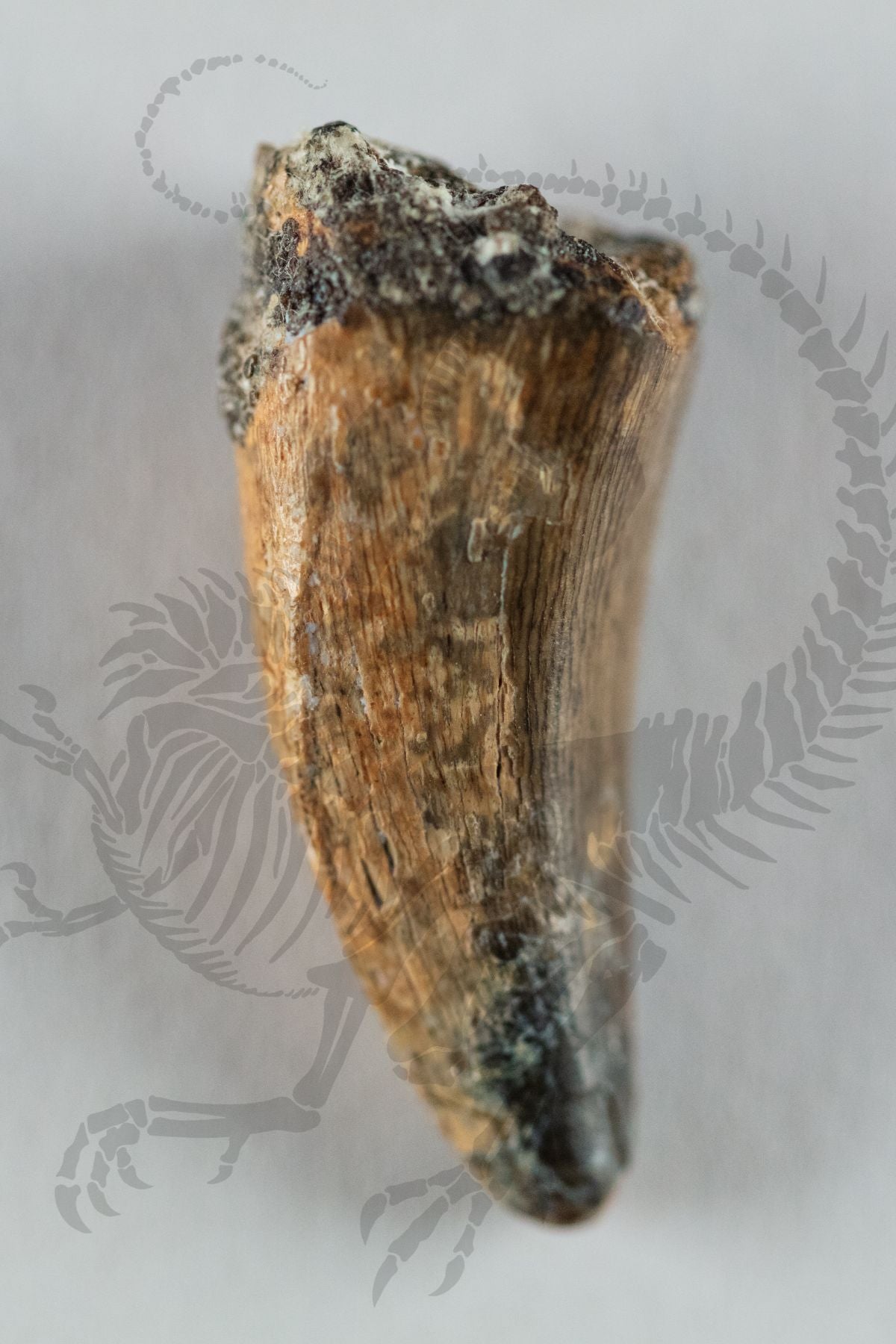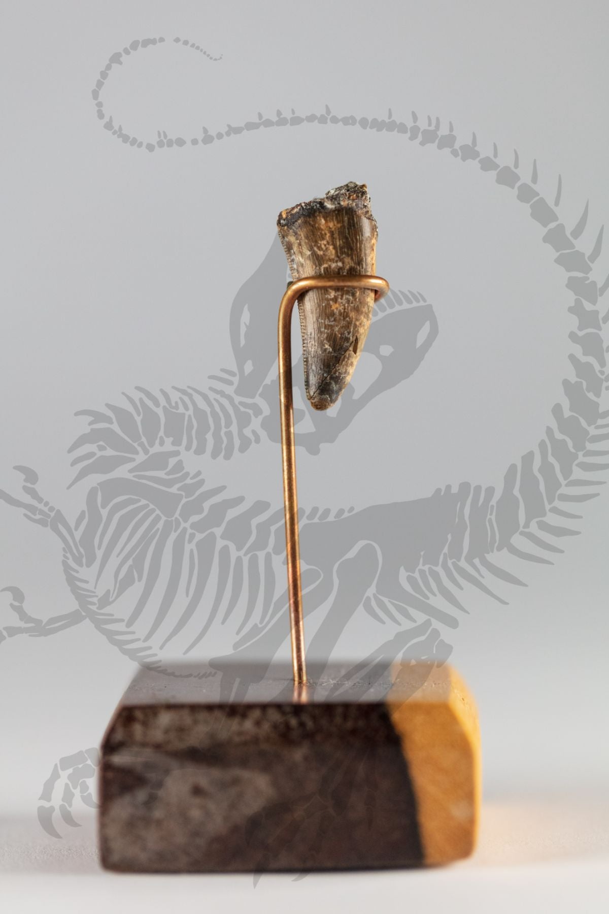 Tyrannosaurus rex is possibly the most iconic and impressive apex predator of all time, with its teeth being possibly the most iconic and impressive part of the animal respectively. This beautiful chocolate colored authentic T. rex tooth is the tip of what could've been a banana sized weapon. This incredible fossil from the Lance Formation of Wyoming, USA has perfectly preserved enamel and stunning serrations, a signature of the many dinosaurs that surely fell to this incredible carnivore. Comes on a custom hardwood mount. Tyrannosaurus rex was a giant predator that ruled the North American forests during the Late Cretaceous, about 65 mya. Arguably the largest land predator to have ever walked the earth, other meat eating dinosaurs were possibly longer than T. rex, but none as tall or heavy. T. rex was the apex predator in its environment, hunting prey like Triceratops, Ankylosaurus, Alamosaurus, & Edmontosaurus with possibly the most powerful bite force ever.