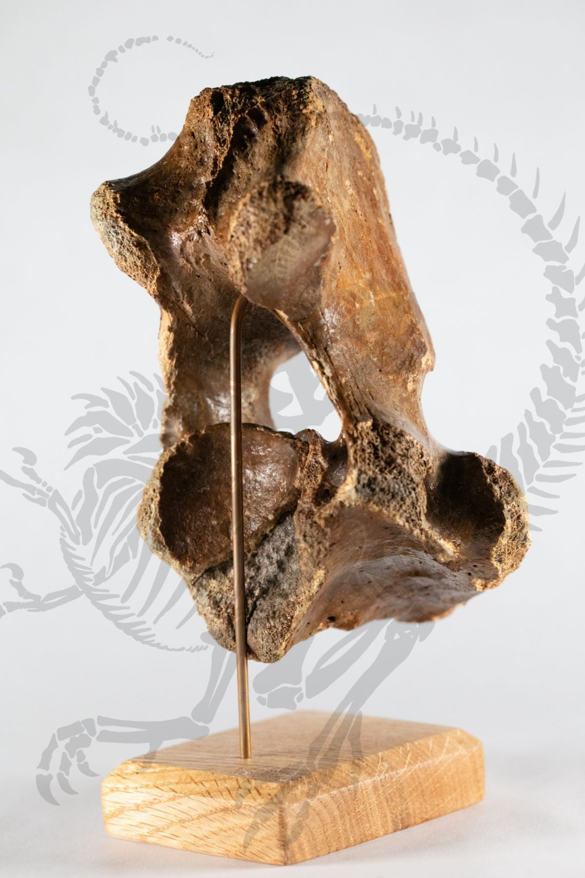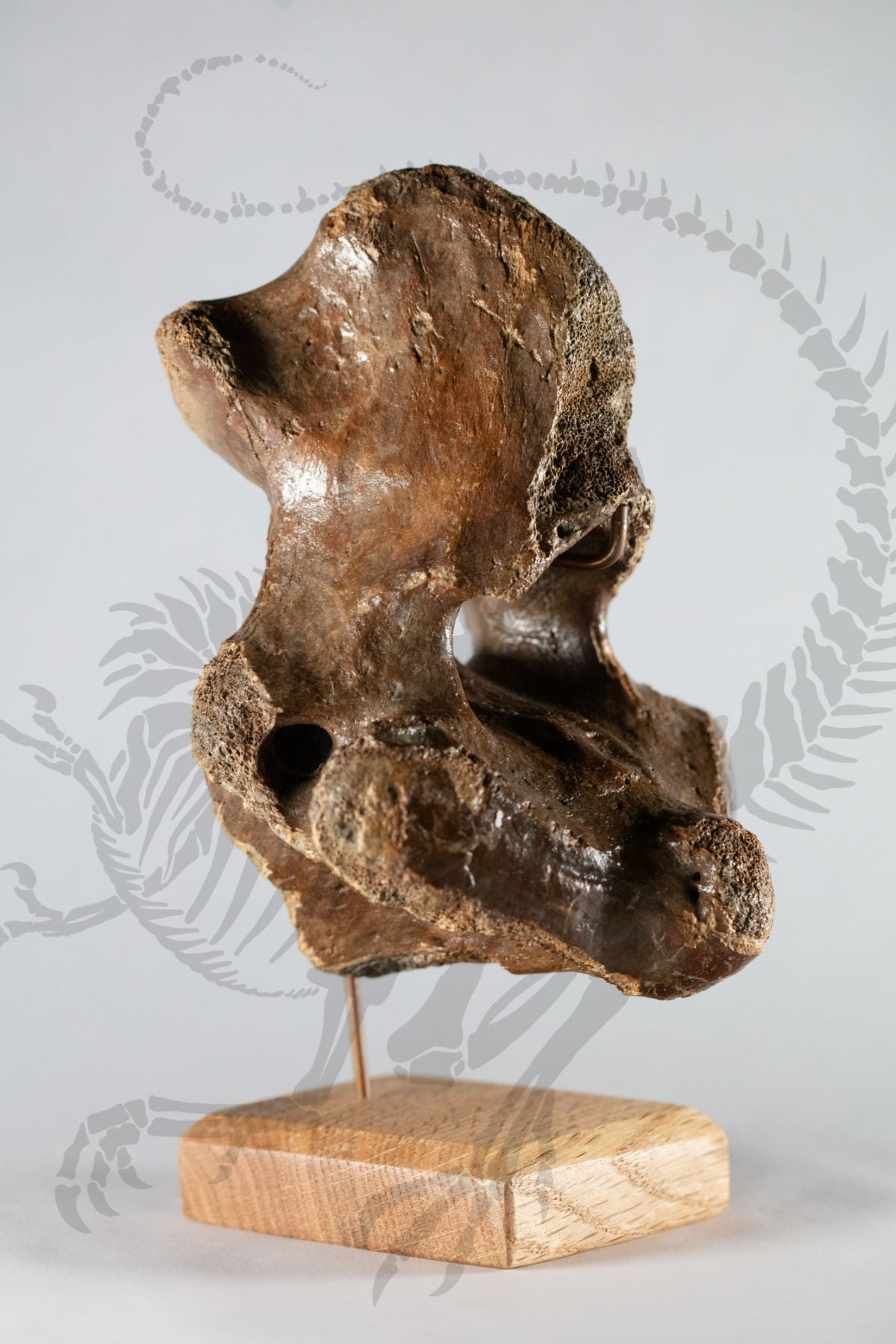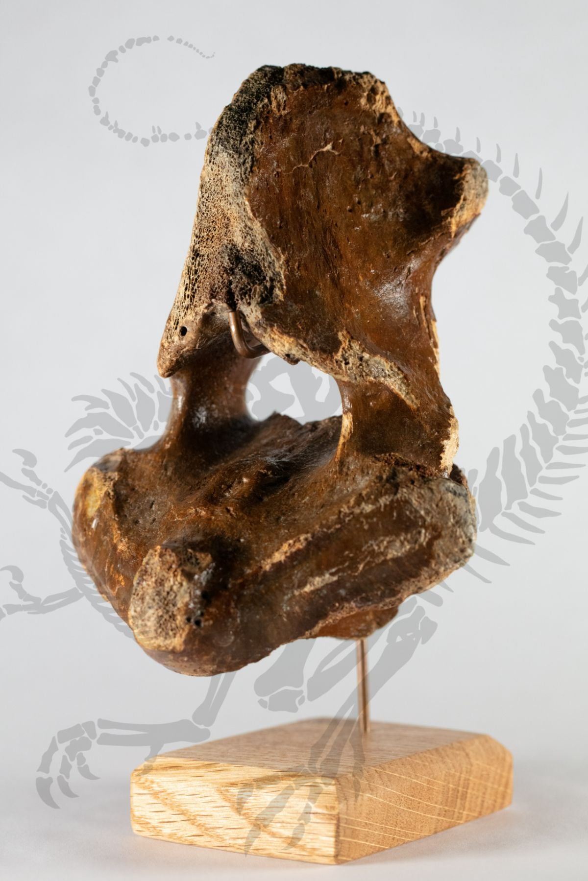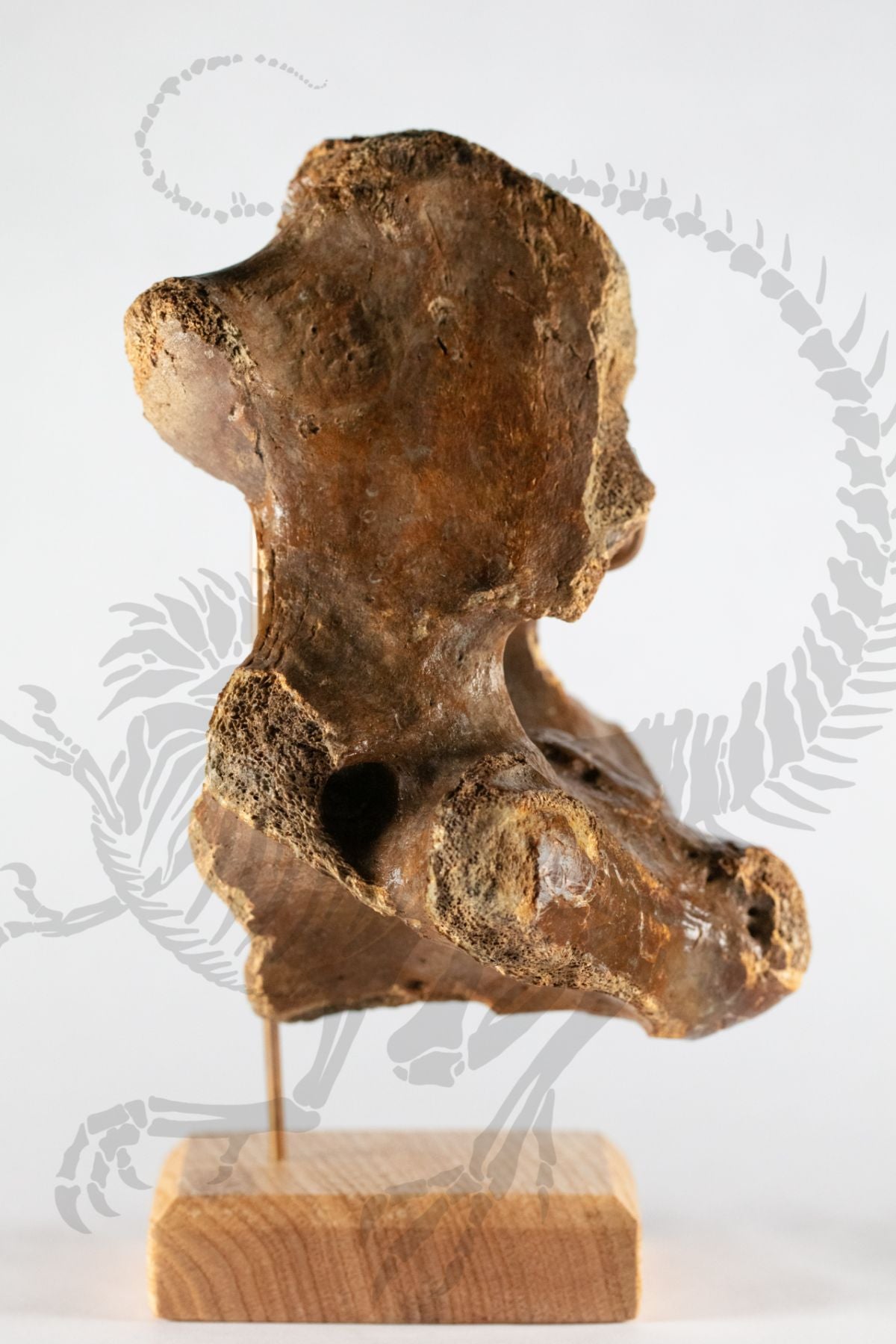 This real vertebra belonging to a prehistoric Wooly Rhino is an atlas, meaning the first vertebra in the spinal column and would've directly connected to the skull. Beautifully preserved, this vertebra would be at home in any collection or exhibition, displayed on an included stunning custom hardwood mount. The Wooly rhinoceros is a large prehistoric species of rhinoceros that lived and went extinct in North America during the Pleistocene period, about 16,000 years ago. It had long, shaggy fur built to help it survive the colder glacial periods of the Pleistocene. It had two horns, the bigger of which could get over 3 feet long!
